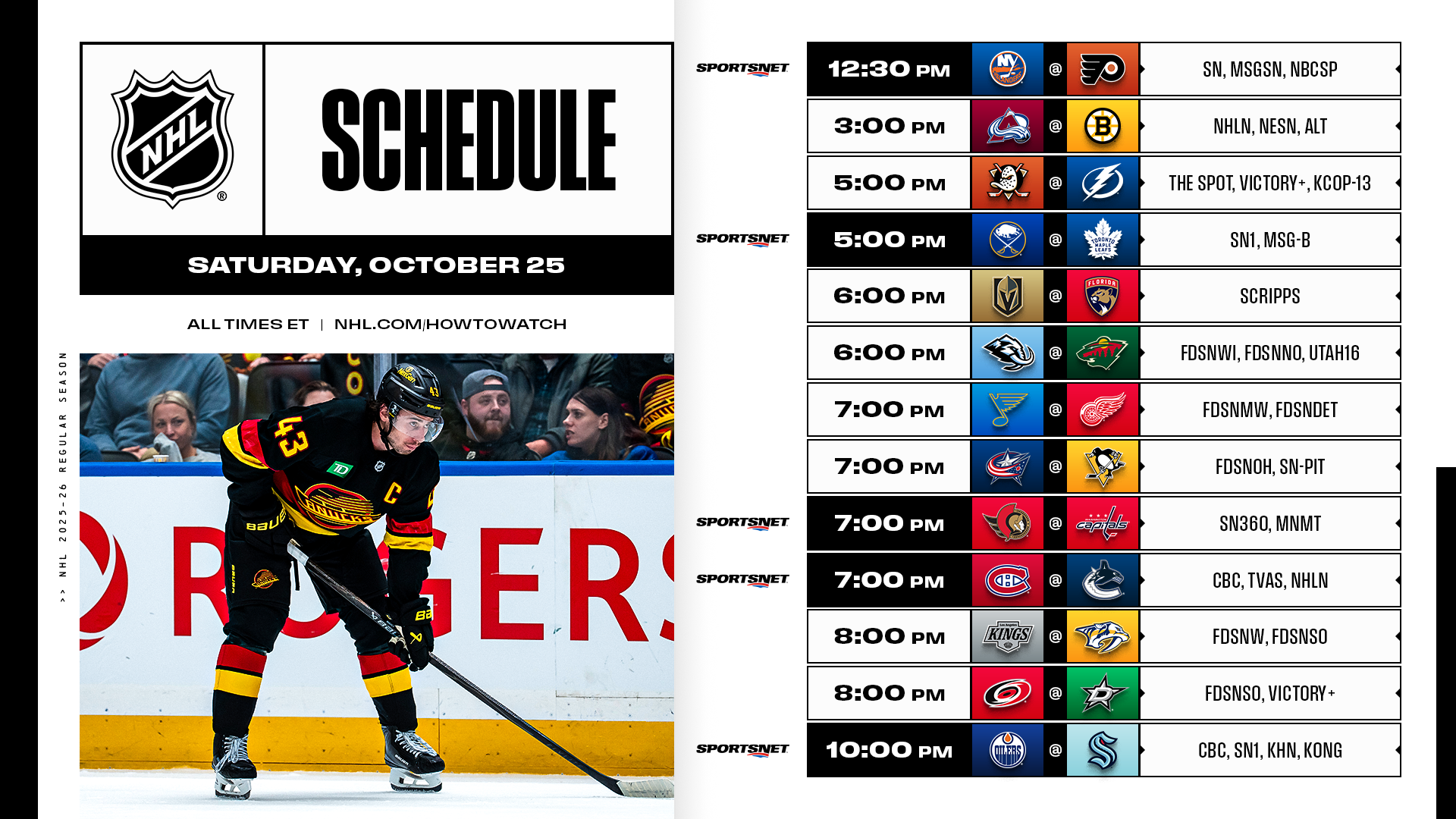 * Saturday’s 13-game schedule features four Hockey Night in Canada contests, including the second meeting between decorated defensemen Quinn Hughes and Lane Hutson.