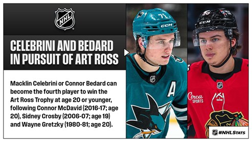 * The 2025-26 Art Ross Trophy race is off to a competitive start with six 30-point players already this season – a group that includes 19-year-old Sharks forward Macklin Celebrini (14-20—34 in 23 GP; 2nd) and 20-year-old Blackhawks forward Connor Bedard (13-18—31 in 22 GP; t-4th). There has only been one other season to feature two players age 20 or younger in the top five in scoring at this stage of a campaign or later (tied or outright; min. 360 GP): 1981-82 (Wayne Gretzky & Denis Savard).