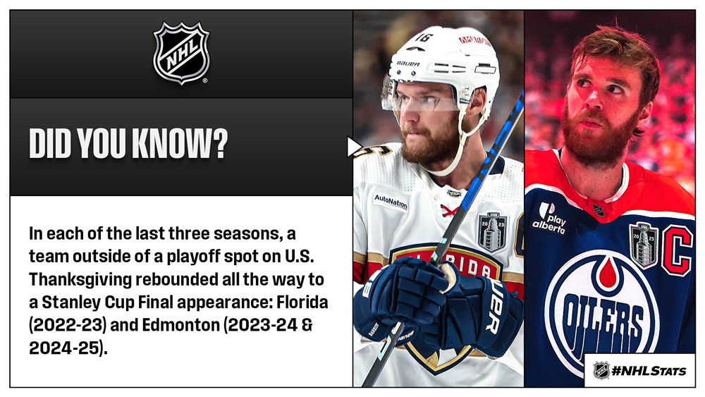 * Since 2013-14, at least three teams sitting outside of the playoffs at U.S. Thanksgiving have gone on to qualify for the postseason in years using the Wild Card format, including as many as five in 2017-18 (ANA, BOS, COL, MIN, PHI) and 2018-19 (CAR, NYI, PIT, STL, VGK). The races for a postseason berth went right down to the wire last season, as the 2024-25 campaign became the first under the 16-team format (since 1979-80) to feature three teams clinch a playoff spot in their final game of the season (MIN, STL and MTL).