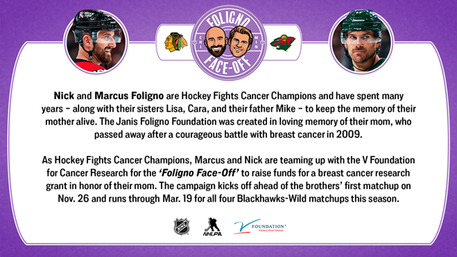 The first meeting between the Wild and Blackhawks, which will be broadcast nationally across the U.S. on ESPN+ and Hulu, kickstarts the Foligno Face-Off. Despite Nick being out of Chicago’s lineup Wednesday, him and Marcus are joining forces off the ice with the NHL, NHLPA, the V Foundation for Cancer Research, the Wild and Blackhawks through Hockey Fights Cancer to raise critical funds for breast cancer research — in honor of their late mother, Janis. Click here for more details on the season-long initiative.