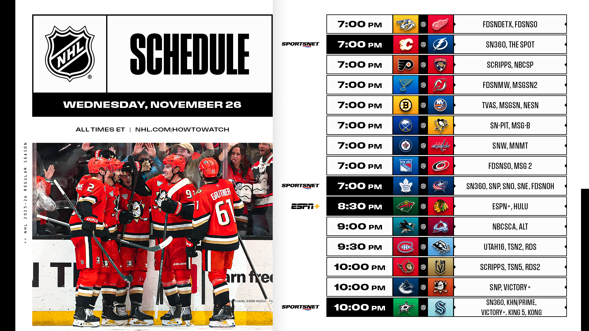 Wednesday’s 15-game slate marks the final NHL contests before U.S. Thanksgiving (with 15 more games set for Friday after an off-day on Thursday) and includes intrigue in the standings: six teams are currently in a playoff position that did not qualify for the postseason last year (Anaheim, Seattle, Utah, Detroit, NY Islanders and Boston), as well as other close races in the standings across the board.