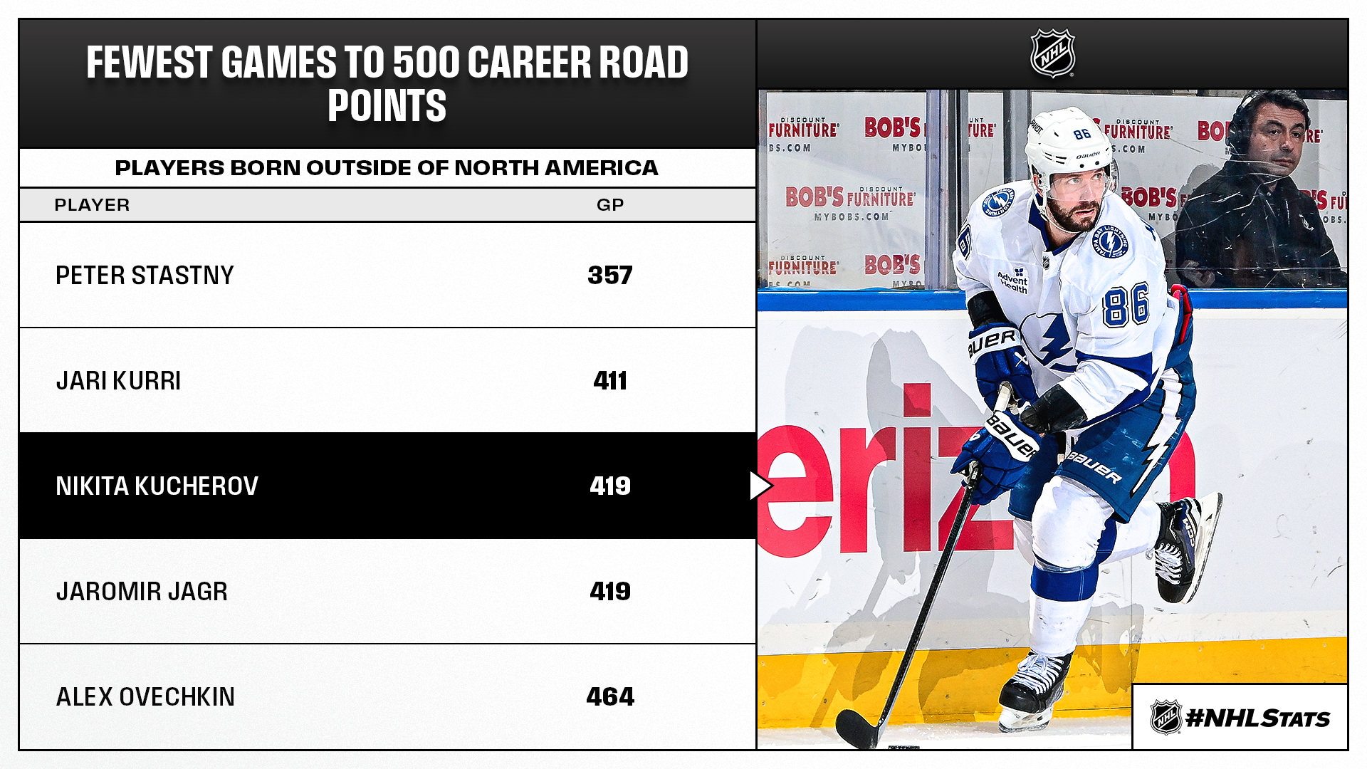 * Nikita Kucherov scored twice to lift the Lightning to victory and joined Steven Stamkos (269-247—516 in 536 GP) as the second player to record 500 road points with the franchise (175-326—501 in 419 GP). Kucherov became the second-fastest active player to reach the benchmark behind Connor McDavid (355 GP).