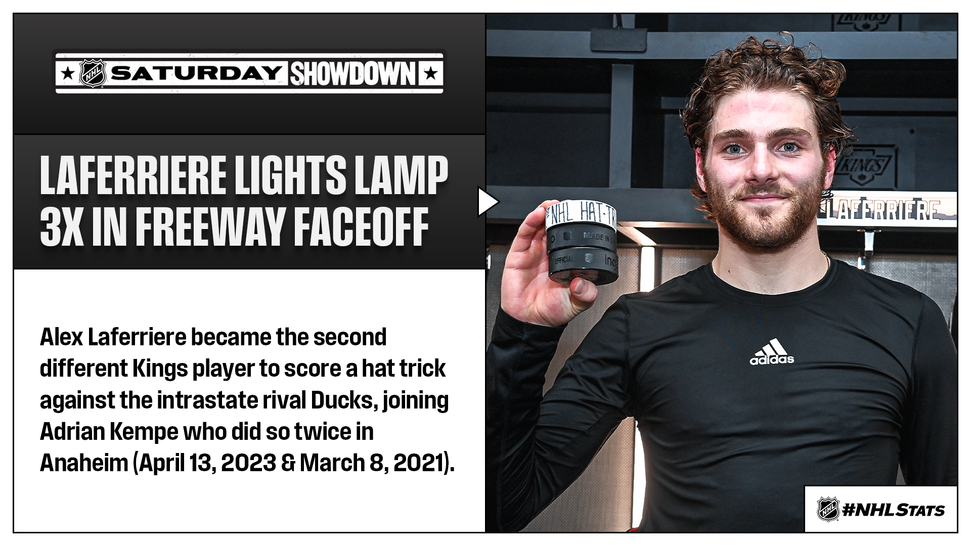 * Alex Laferriere (3-0—3) netted a hat trick with the help of Anze Kopitar (0-3—3) as Los Angeles scored six goals against Anaheim en route to victory – its second-highest single-game total against its intrastate rival behind a seven a seven-goal showing exactly 30 years ago. While Laferriere netted the first hat trick by a Kings player this season, Kopitar recorded his 321st career multi-point game and tied Luc Robitaille for the second most in Kings history behind Marcel Dionne (392).