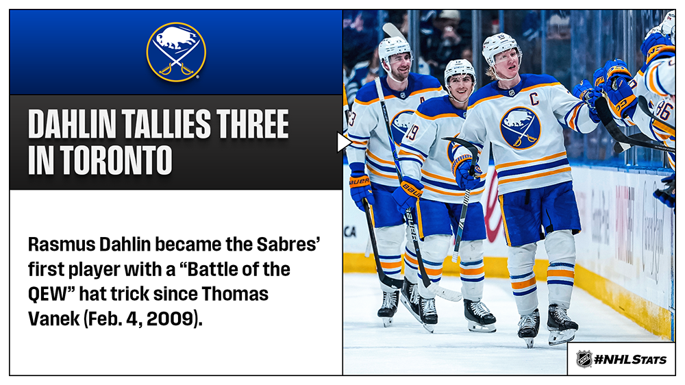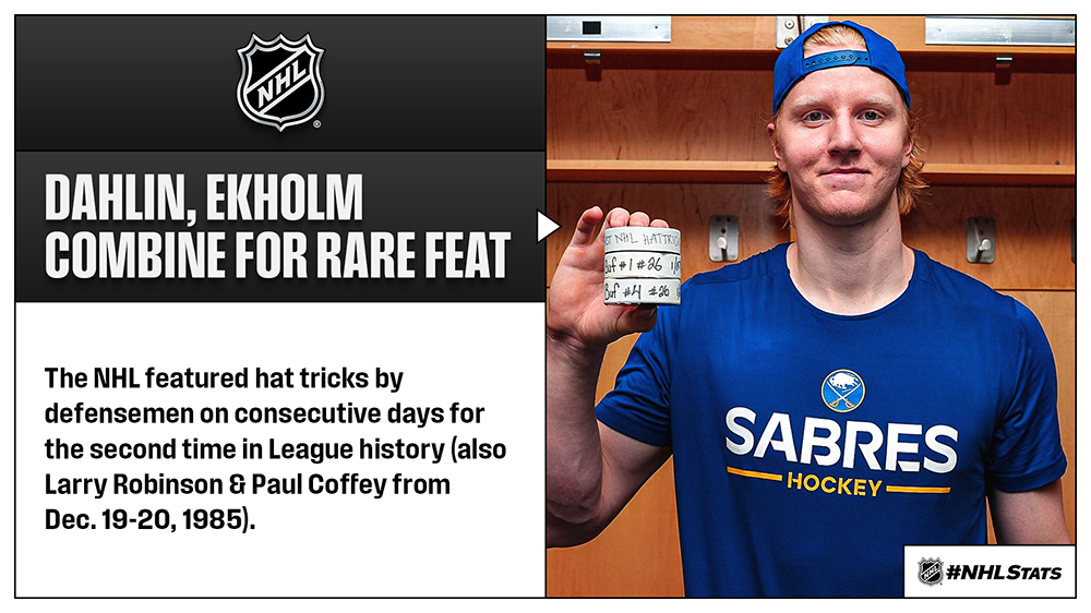 * Rasmus Dahlin became the League’s latest defenseman with a three-goal game and recorded the NHL’s 28th hat trick since Jan. 1, tying February 1981 for the second most in a calendar month behind December 1985 (29).