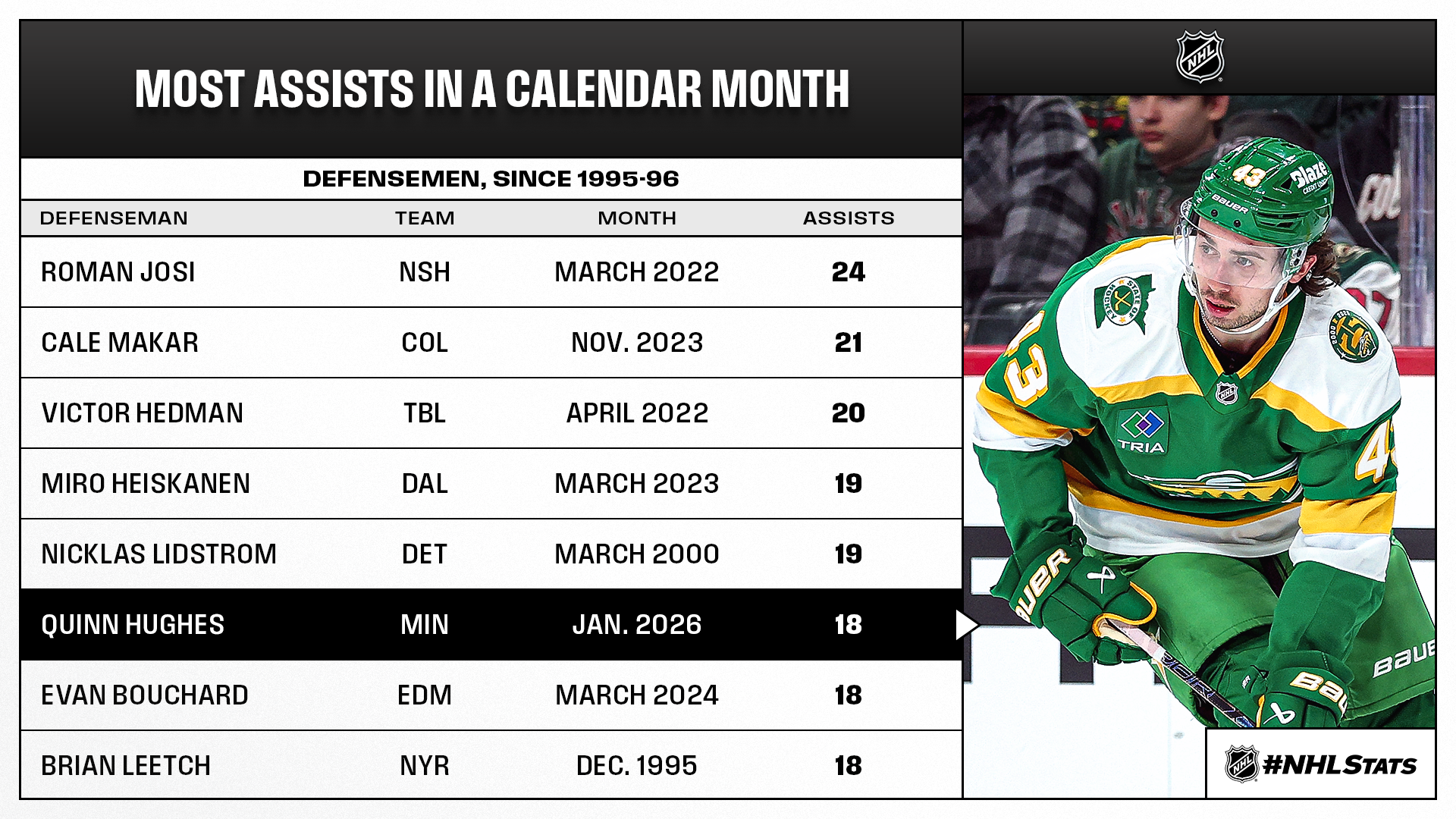 * Quinn Hughes (0-1—1) factored on the second of three straight goals in regulation and extended his assist streak to six games – one shy of the longest by a defenseman in franchise history (Jared Spurgeon: 7 GP in 2021-22 & Ryan Suter: 7 GP in 2013-14). His 18 assists are the third most among all players this month and already the most by a player in a single month in franchise history.