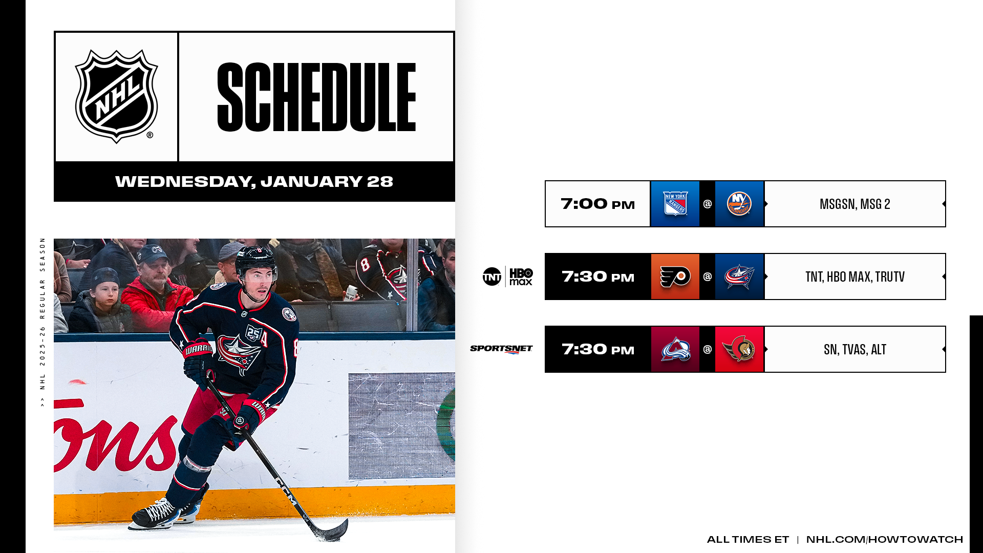A three-game Wednesday slate features a Metropolitan Division showdown that pits Trevor Zegras and the Flyers (24-18-9, 57 points) against Zach Werenski and the Blue Jackets (24-20-7, 55 points) broadcast nationally in the United States (TNT, HBO MAX, truTV). North of the border, Nathan MacKinnon (38-50—88 in 50 GP) will look to become the second player to reach the 90-point mark this season when the League-leading Avalanche (35-6-9, 79 points) clash with the Senators (24-21-7, 55 points) on Sportsnet and TVA Sports.