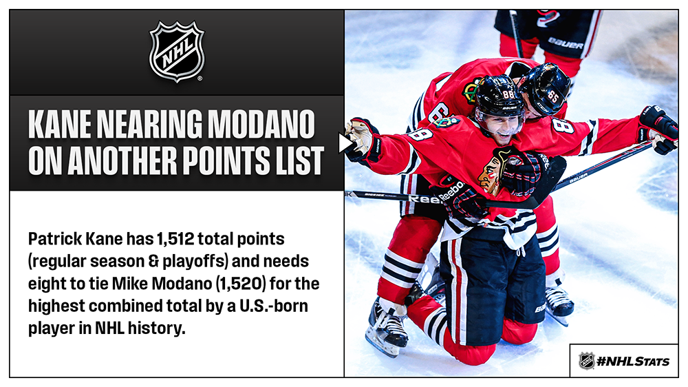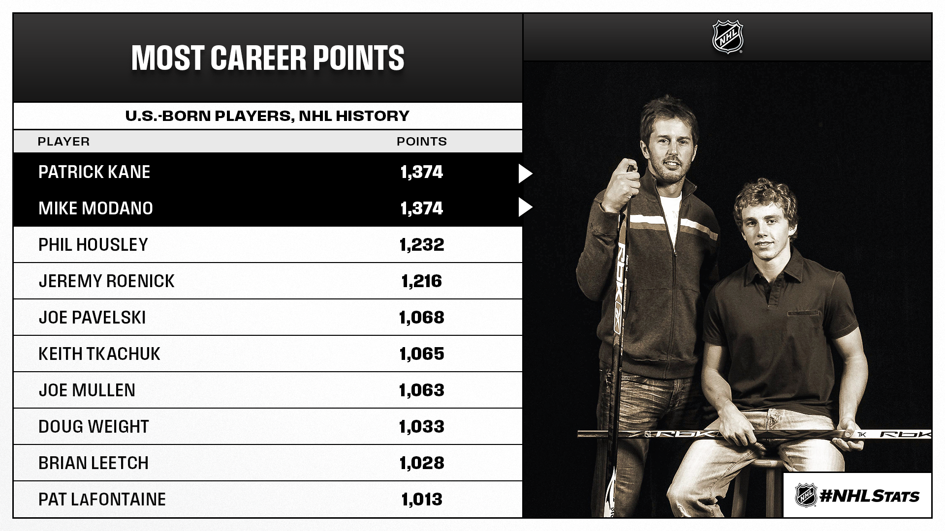 Patrick Kane had an assist versus longtime opponent Drew Doughty and the Kings to reach 1,374 career points and tie Mike Modano as the NHL’s all-time scoring leader among U.S.-born players, a title Modano has held since tallying twice against San Jose more than 18 years ago on Nov. 7, 2007.