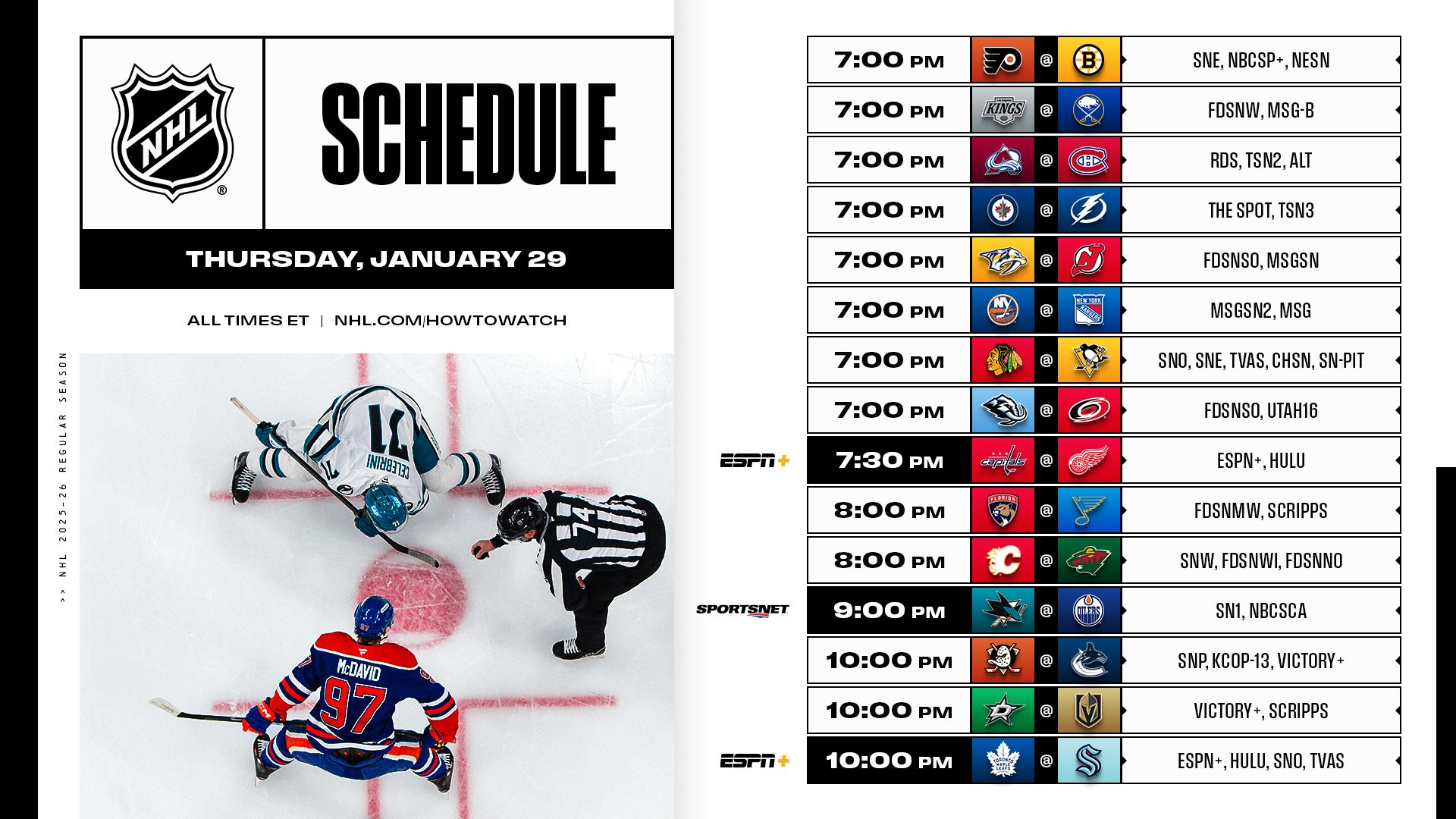* Players heading to Milan next week span the entirety of tonight’s 15-game NHL schedule, from Macklin Celebrini versus Connor McDavid (both Team Canada) in Edmonton; to David Pastrnak (Team Czechia) and Jake Guentzel (Team USA) competing in their final contests before the 2026 Navy Federal Credit Union NHL Stadium Series; to Nico Hischier hosting Roman Josi (both Team Switzerland) in Newark.