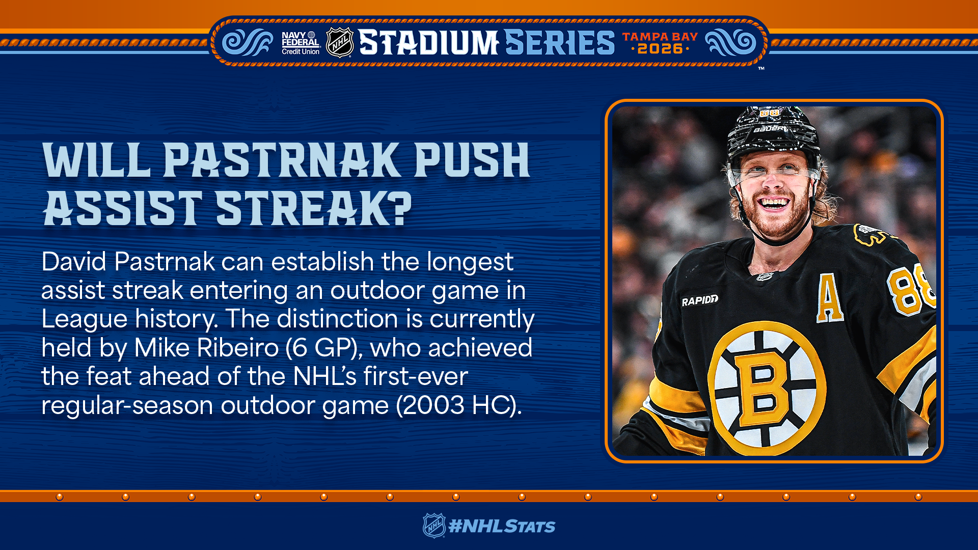 * David Pastrnak, who is currently riding an eight-game point streak and, along with his upcoming Stadium Series foe Kucherov, is one of two players with 20 assists in January (5-20—25 in 13 GP). He needs three more helpers tonight to tie Bobby Orr (23 in March 1971) for the most in a calendar month in Bruins history as he also looks to establish a new League benchmark for longest assist streak entering an outdoor game.