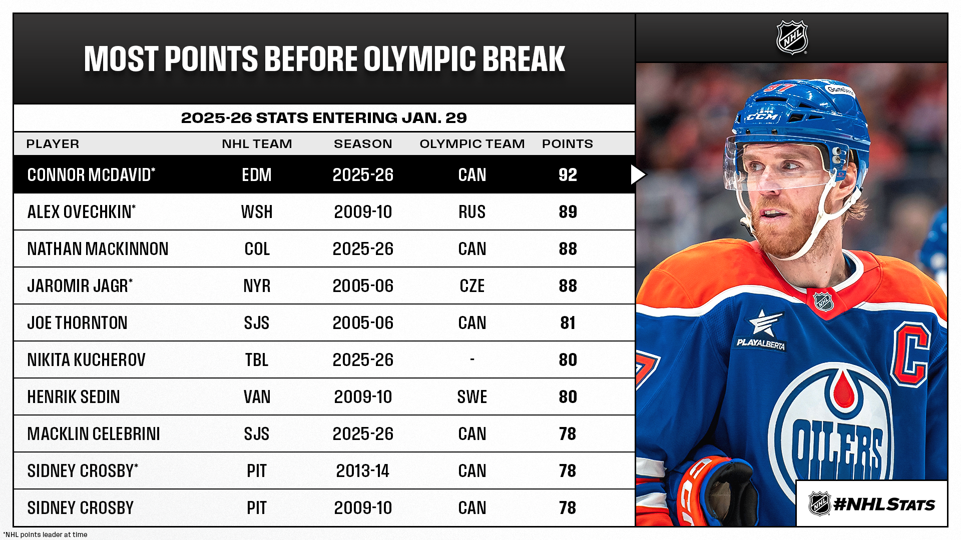 * McDavid will be one of 19 Team Canada returnees from the country’s championship squad at the 4 Nations Face-Off last February – where McDavid scored the overtime goal to secure the title. McDavid has added 154 NHL points to his total since scoring that goal (121 regular season, 33 playoffs), a count that features a League-leading 92 points so far in 2025-26. Pursuing his ninth career 100-point season, McDavid will head to Milan with the most points by any player before an Olympic break if he maintains his advantage over second-place Nathan MacKinnon (also part of the Team Canada roster).