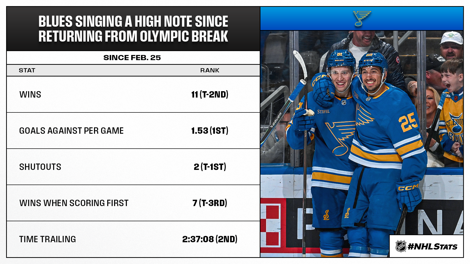The Jets and Blues have made significant efforts to climb the Western Conference standings since the NHL returned from the Olympic break and kept their postseason dreams in sight with two crucial points as the race for Wild Card 2 features six teams separated by just four points.