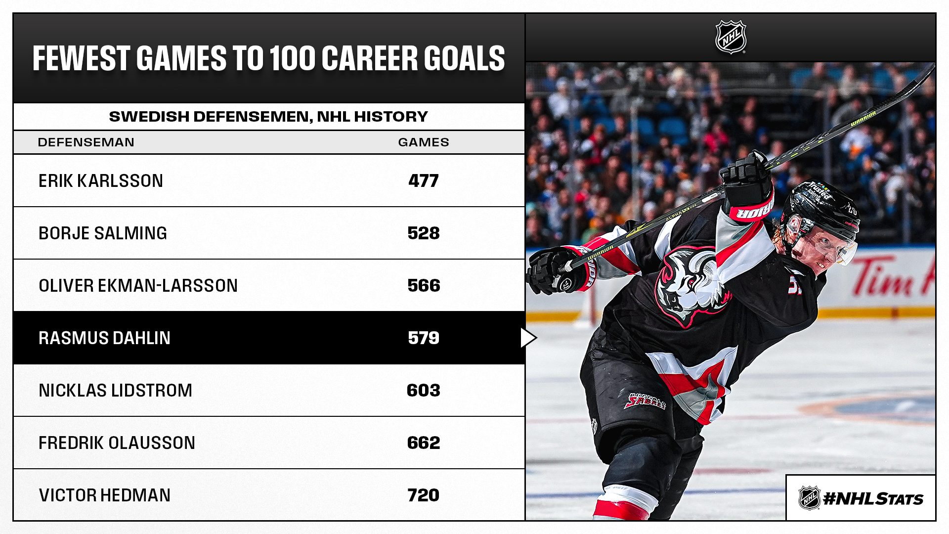 * Captain Rasmus Dahlin (1-0—1) kickstarted Buffalo’s multi-goal comeback win with his 100th career goal as the Sabres (45-21-8, 98 points) registered 45 victories in a single season for the 11th time in franchise history (last: 45 in 2009-10). Dahlin (100-327—427 in 579 GP) joined Phil Housley (178 G) as the second Sabres defenseman with 100 career goals.