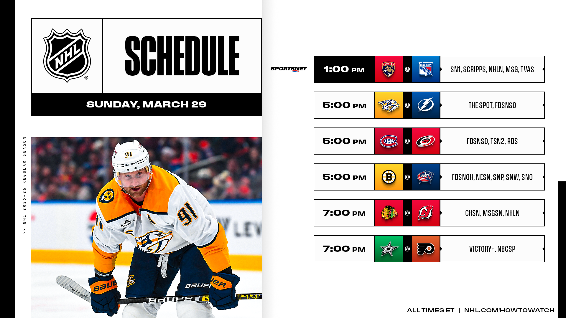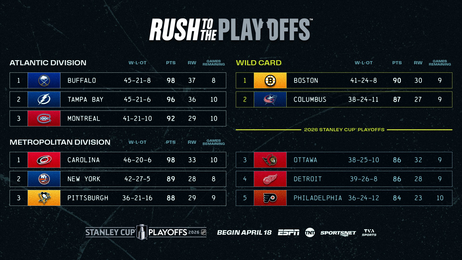 Sunday’s six-game slate is set to see Steven Stamkos square off against his former team when the Predators (34-30-9, 77 points) play the Lightning (45-21-6, 96 points), who can tie the Sabres (45-21-8, 98 points) for the most points in the Atlantic Division. Other key matchups in the Push to the Playoffs include the Hurricanes (46-20-6, 98 points) hosting the Canadiens (41-41-10, 92 points), the Blue Jackets (38-24-11, 87 points) battling the Bruins (41-24-8, 90 points) and the Flyers (35-24-12, 82 points) facing the Stars (44-18-11, 99 points).