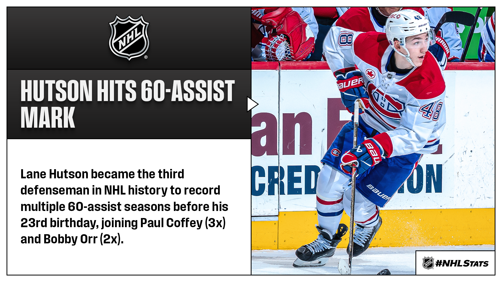 * Hutson registered his 60th assist of 2025-26 and became the fourth active defenseman to reach the mark in consecutive seasons, following Quinn Hughes (4 from 2021-22 – 2025-26), Cale Makar (2 from 2023-24 – 2024-25) and Adam Fox (2 from 2021-22 – 2022-23). Only two other players – both forwards – in Canadiens history have achieved the feat: Guy Lafleur (6 from 1974-75 to 1979-80) and Peter Mahovlich (2 from 1974-75 to 1975-76).
