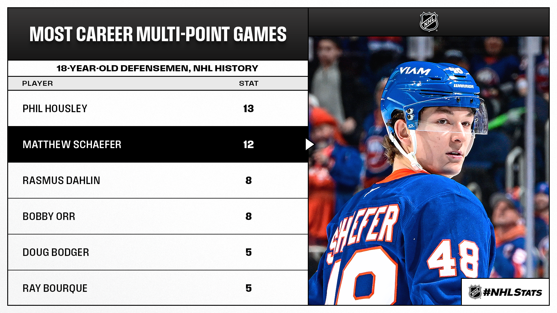 * Matthew Schaefer assisted on two of the Islanders’ five second-period goals as New York (42-27-5, 89 points) passed Pittsburgh (36-21-16, 88 points) and Columbus (38-24-11, 87 points) for second place in the Metropolitan Division. Schaefer, who reached 56 points on the campaign and tied Stefan Persson (56 in 1977-78) for the Islanders single-season record for points by a rookie defenseman, moved within one point of Phil Housley (57) for the most career points by an 18-year-old defenseman in NHL history.