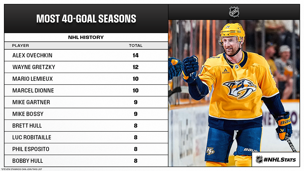* Stamkos needs four tallies for his eighth career 40-goal season and first since joining Nashville after 16 campaigns with Tampa Bay including parts of 11 as captain. Stamkos would be the third different 40-goal scorer for the Predators, who have gone 5-2-0 in their last seven games and occupy the Western Conference’s final Wild Card spot.