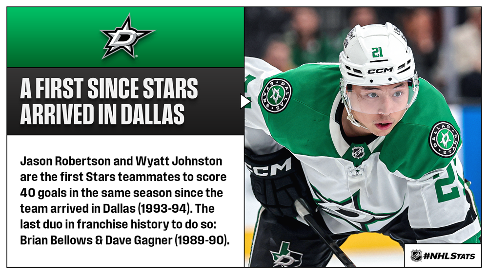 * Robertson joined Johnston as the second Stars player with 40 goals this season. It marked Robertson’s third 40-goal season with the franchise, tied with Brian Bellows (3x) for the second most in Stars/North Stars history behind Dino Ciccarelli (4x).