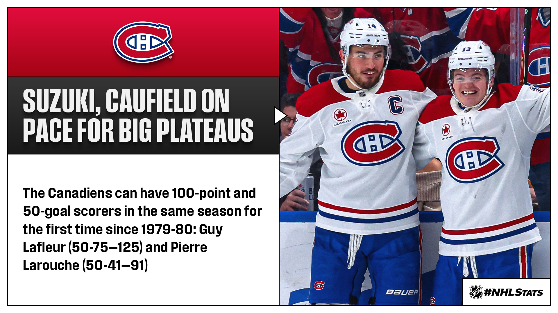 * The Canadiens are on pace to feature a 50-goal scorer and a 100-point getter for the first time in more than 45 years as Cole Caufield and Nick Suzuki continued their scoring ways while Lane Hutson joined an exclusive list in NHL history by also finding the score sheet.