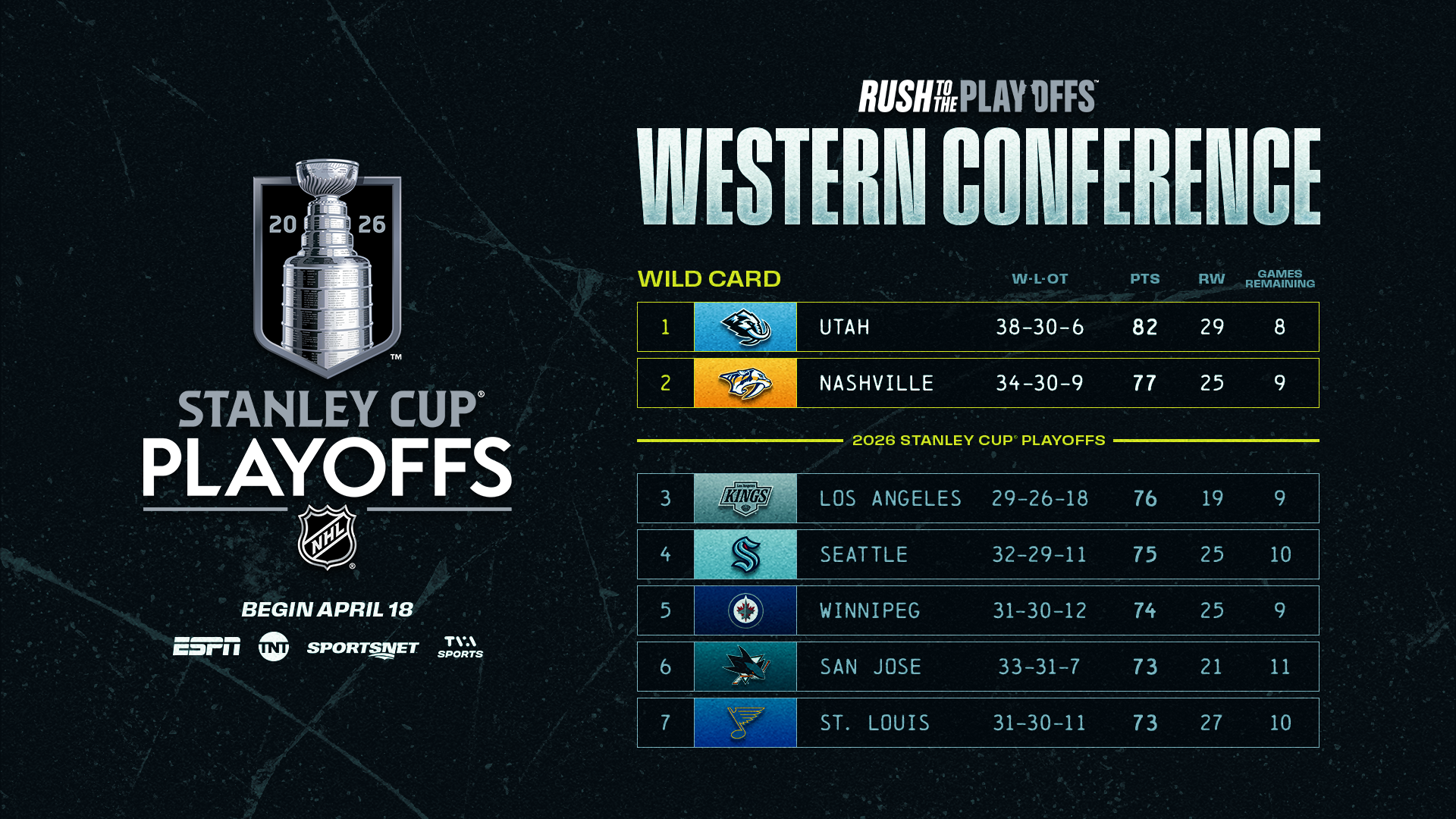 After the NHL has featured at least one team clinch a playoff spot in its final game of the season in each of the past three campaigns, the logjammed Wild Card race in the Western Conference produced no further clarity following a 15-game Saturday. The Wild Card 1-seeded Mammoth (38-30-6, 82 points) skated to victory while the Jets (31-30-12, 74 points), Sharks (33-31-7, 73 points) and Blues (31-30-11, 73 points) also collected two crucial points – three of six teams separated by four points.