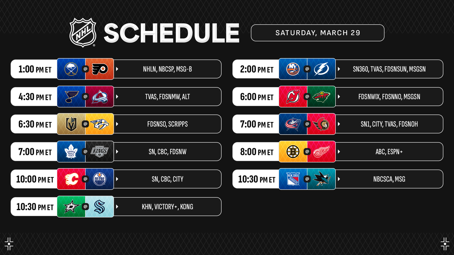 * Saturday features several games with major postseason implications as the Rush to the Stanley Cup Playoffs continues during a busy slate highlighted by an ABC Hockey Saturday game in prime time and three Hockey Night in Canada contests – including one between the two Eastern Conference Wild Card teams. Dallas can also become the third team to clinch a postseason berth.-29054318.png)