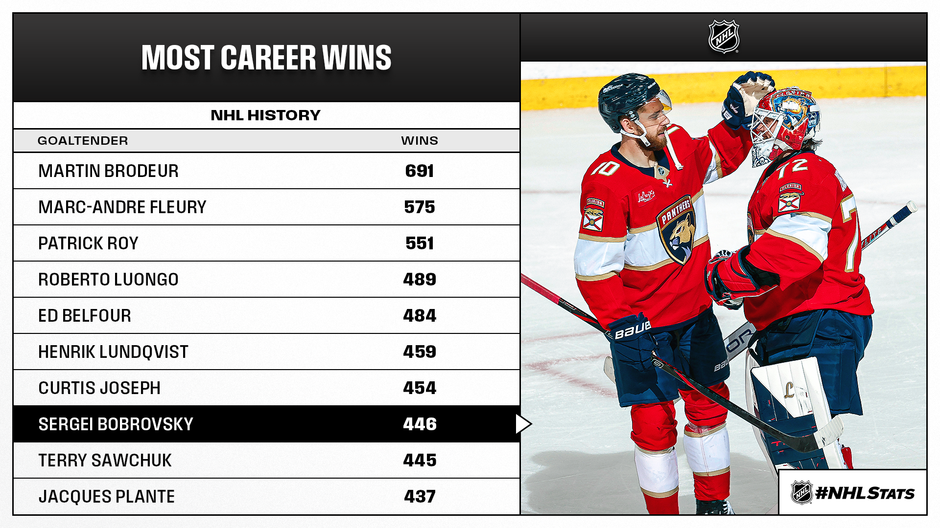 * Bobrovsky made 22 saves to earn his 17th win of the season, tying Avalanche goaltender Scott Wedgewood for the League lead. In the process, he surpassed Terry Sawchuk for sole possession of eighth on the NHL’s all-time wins list.