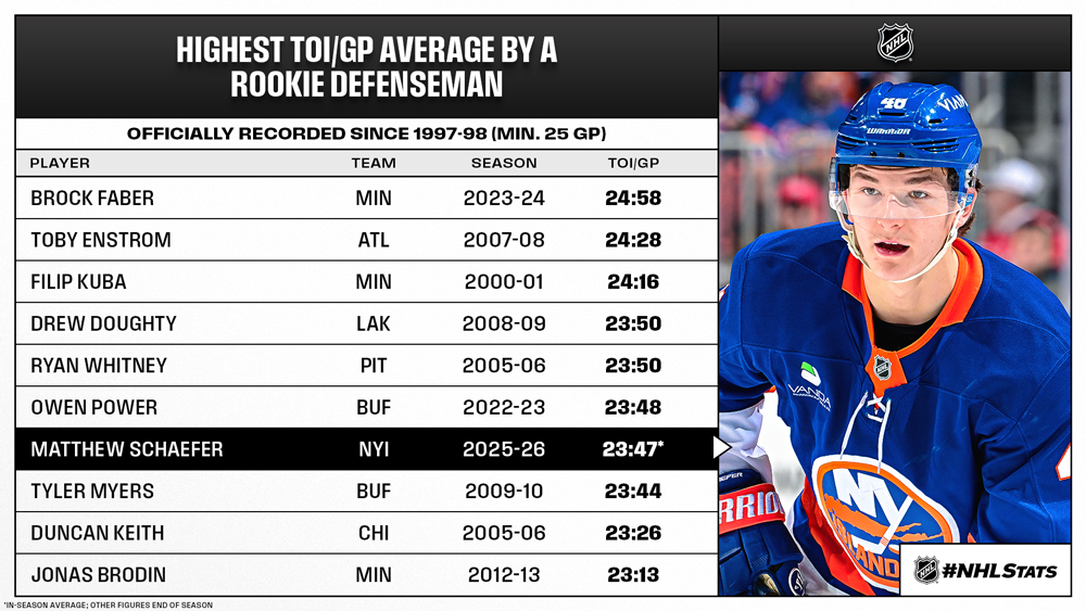 * Eighteen-year-old rookie defenseman Schaefer (9-15—24 in 39 GP) leads all Islanders skaters with an average of 23:47 time on ice per game. The Islanders (21-14-4, 46 points) enter play second in the Metropolitan Division in a hunt to return to the postseason after missing in 2024-25. Schaefer can become the second teenager, and only 18-year-old (age at end of season), to lead his entire team in time on ice per game at season’s end (since officially tracked in 1997-98; min. 41 GP). He would join Drew Doughty (2008-09 w/ LAK).