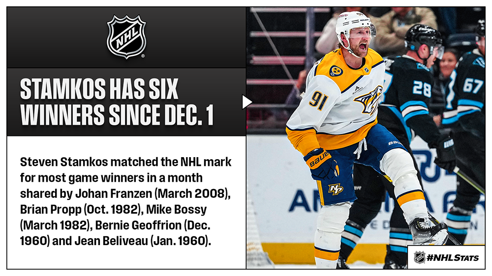 * Steven Stamkos (2-1—3) became the second player in franchise history with the winning goal in four straight victories following Mike Fisher (4 from Jan. 23 – Feb. 4, 2012) and needs one tally for 600 in his career. Stamkos scored his 98th career game-winning goal to tie Bobby Hull and Guy Lafleur for 11th place on the NHL’s all-time list.
