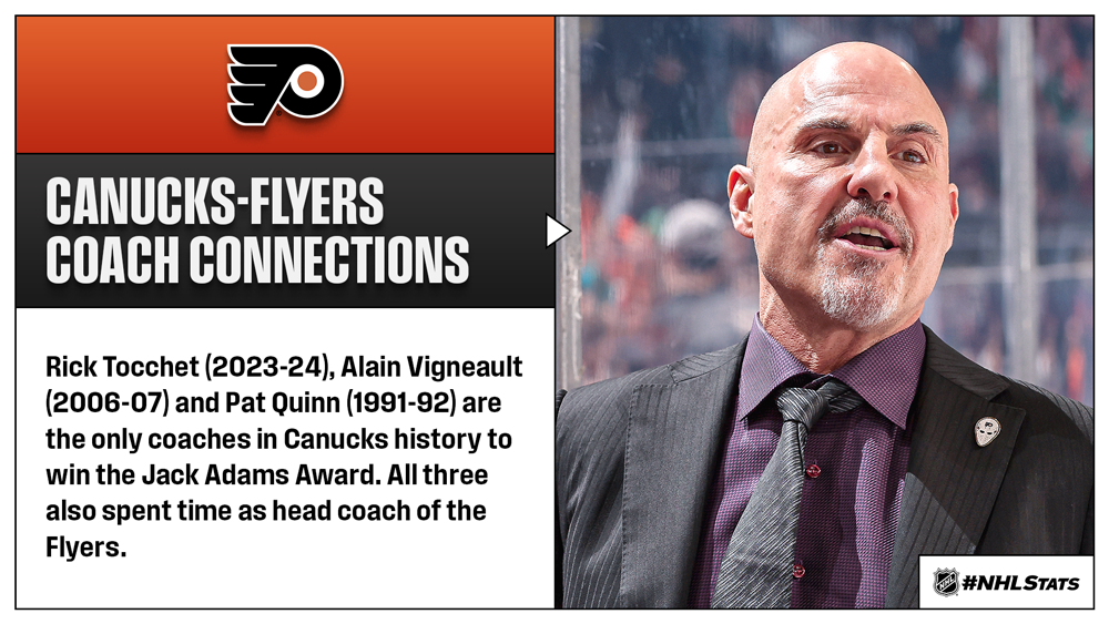* Tocchet will face the Canucks, the team he won a Jack Adams Award with in 2023-24, for the second time in nine days after a 5-2 win in Philadelphia on Dec. 22. Throughout his three-season span as Vancouver head coach, Tocchet led the team to a 108-65-27 record including a first-place finish in the Pacific Division in 2023-24. In his first season behind the bench in Philadelphia, Tocchet has the Flyers (19-11-7, 45 points) sitting third in the Metropolitan Division as they look to return to the postseason for the first time since 2019-20. Read more on Tocchet’s return to Vancouver on NHL.com.