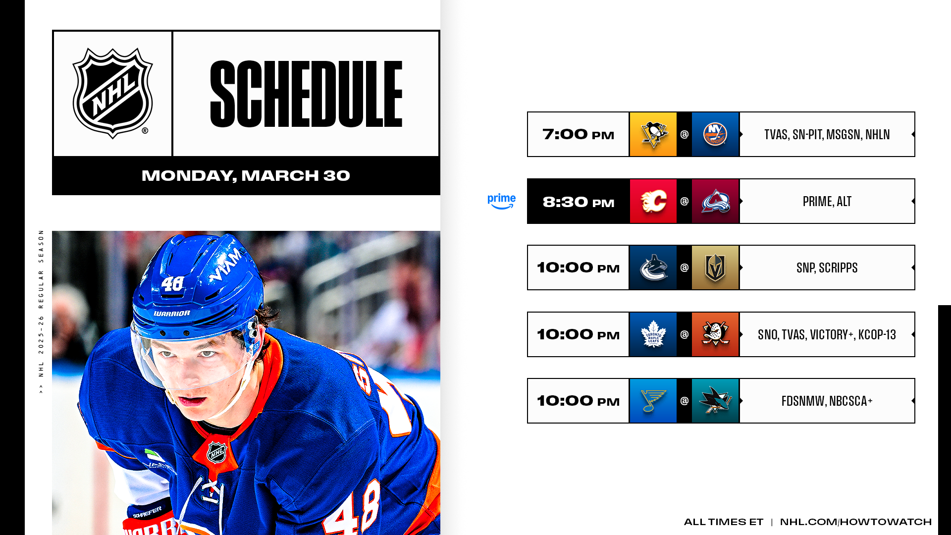 * A five-game Monday will include a Metropolitan Division showdown between the Penguins and Islanders on NHL Network as well as the Avalanche and Flames on Prime Monday Night Hockey.