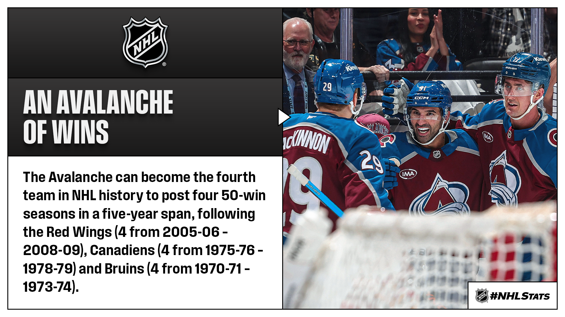 * ABC moves west for the second half of its doubleheader, where the Avalanche (49-15-10, 108 points) and Stars (45-19-12, 102 points) meet in a Central Division clash. Colorado, skating in its 75th game of the season, can establish its second-fastest pace to 50 wins in a campaign behind 2021-22 (70 GP), while Brent Burns is set to join Phil Kessel (1,064 GP) as the second player in NHL history to skate in 1,000 consecutive contests.