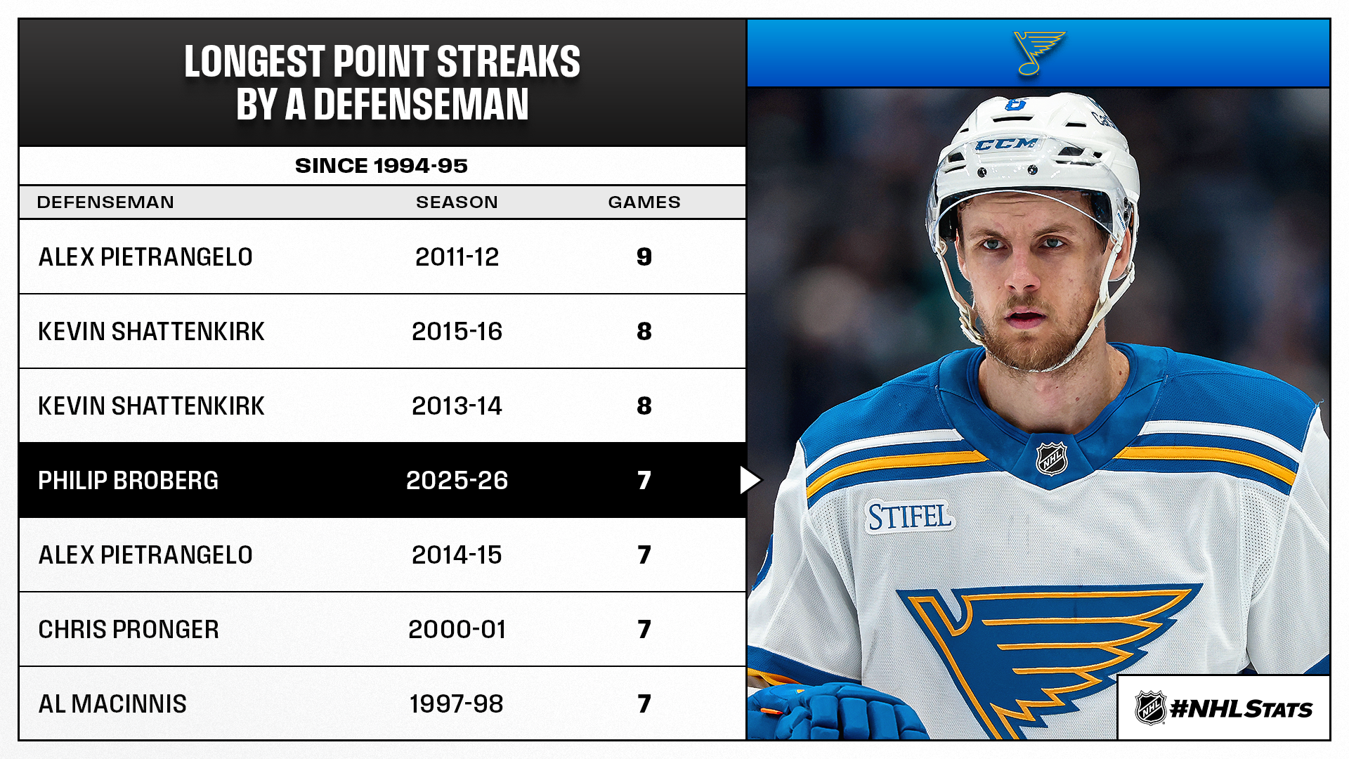 Philip Broberg (0-2—2) and the Blues (32-31-12, 76 points) continued their pursuit of the final Wild Card spot in the Western Conference with a win in Anaheim against the Ducks – who were overtaken by the idle Oilers for top spot in the Pacific Division after the regulation loss. St. Louis, which moved within three points of idle San Jose (36-31-7, 79 points), own the most regulation wins (28) – the first tie-breaker outside of games played – among six clubs battling to get above the playoff line (next closest: NSH, WPG & SEA all w/ 25). Click here for everything you need to know from the latest edition of #NHLStats: Live Updates.
