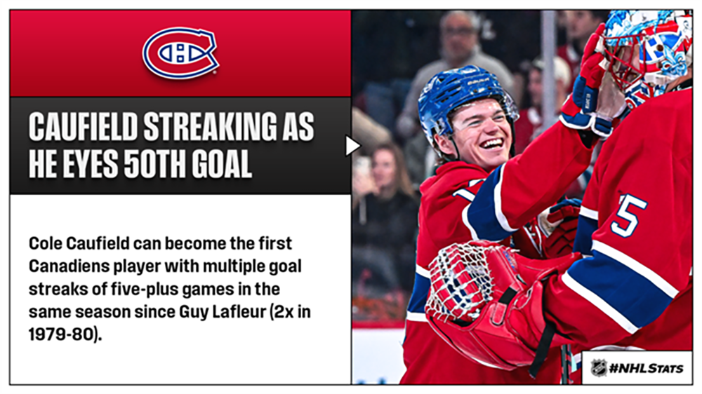 * Montreal (44-21-10, 98 points) will visit New Jersey, where it can earn an eighth straight win and become the sixth team this season to reach 100 points – the last time they hit the mark was in 2016-17 (103 points). Contributing to the Canadiens’ recent success has been Cole Caufield (49-34—83 in 75 GP), whose nine goals since the beginning of the streak (March 21) leads all players. Caufield has scored in each of his past four outings and is on the precipice of the first 50-goal season by a Canadiens skater since Stephane Richer in 1989-90.