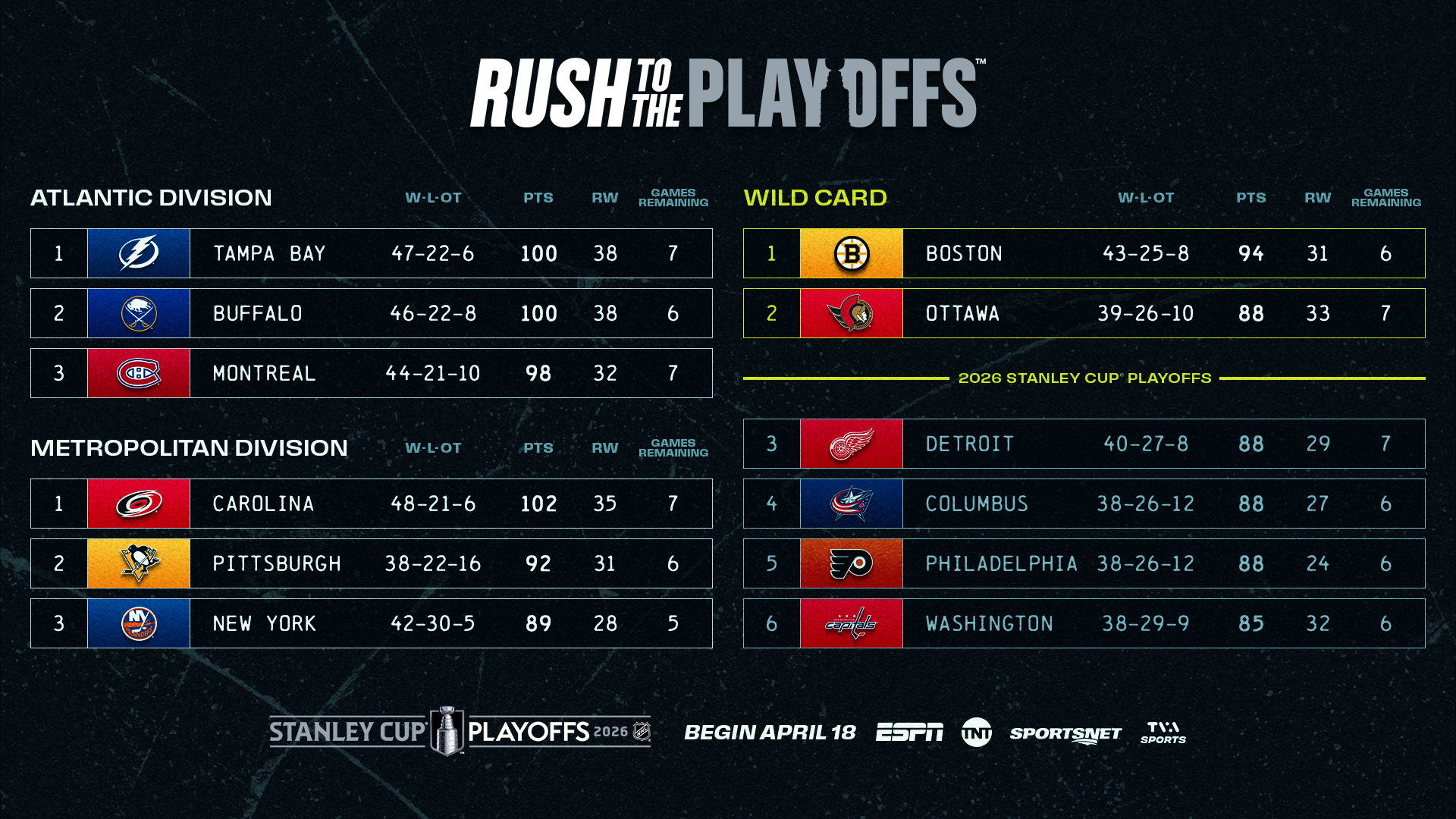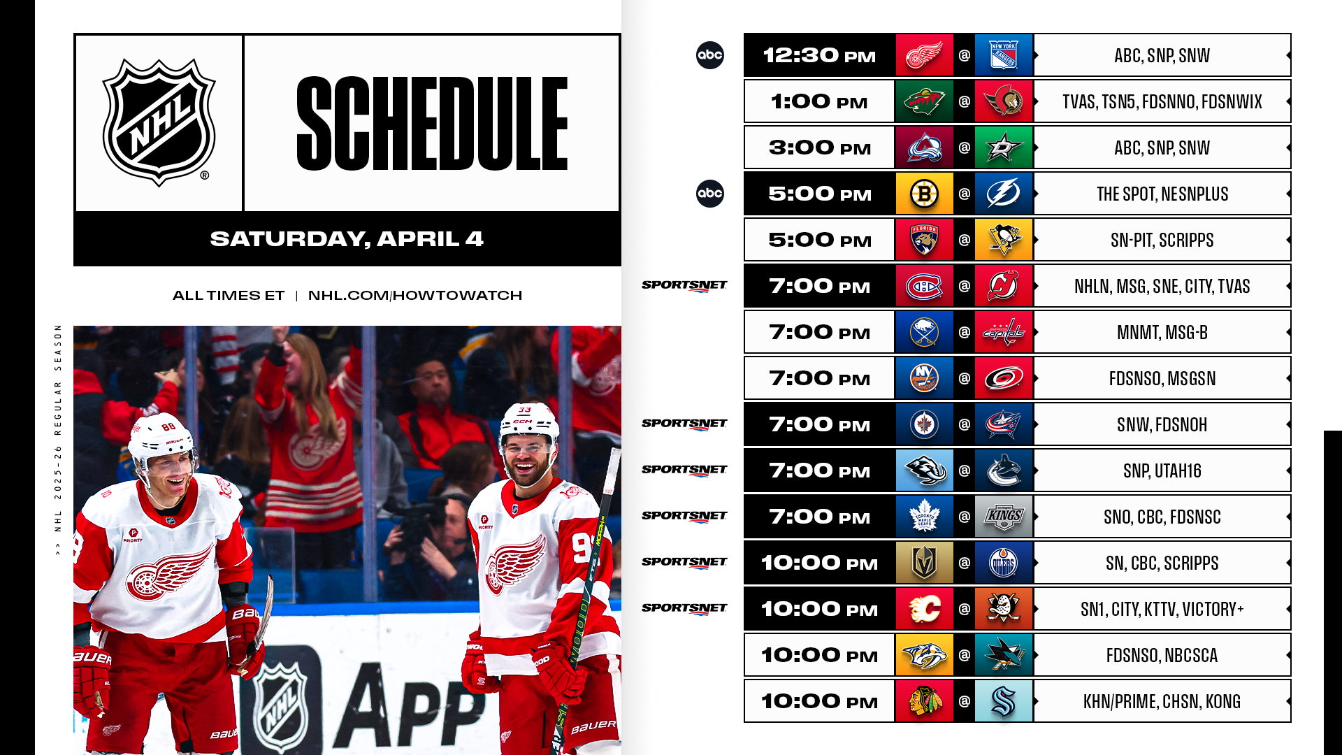 The second last 15-game day of the regular season is packed with national broadcasts and playoff races, featuring a doubleheader on ABC as well as six contests on Hockey Night in Canada.