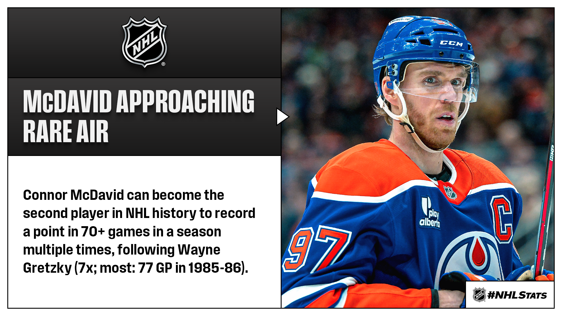 * Connor McDavid (43-83—126 in 76 GP) and the Oilers (39-28-9, 87 points) will put their five-game winning streak on the line in a pivotal Pacific Division duel against the Golden Knights (34-26-16, 84 points) as they aim to maintain their position atop their cohort. The Oilers captain is approaching his third career 130-point season, which would tie Marcel Dionne for the fourth most in NHL history behind Wayne Gretzky (13), Mario Lemieux (6) and Phil Esposito (4). McDavid, the current front runner in the Art Ross Trophy race, has found the score sheet in a League-high 64 games this season and can bump that total to 70 for the second time in his career (75 GP in 2022-23) should he record a point in each of Edmonton’s final six contests of 2025-26.