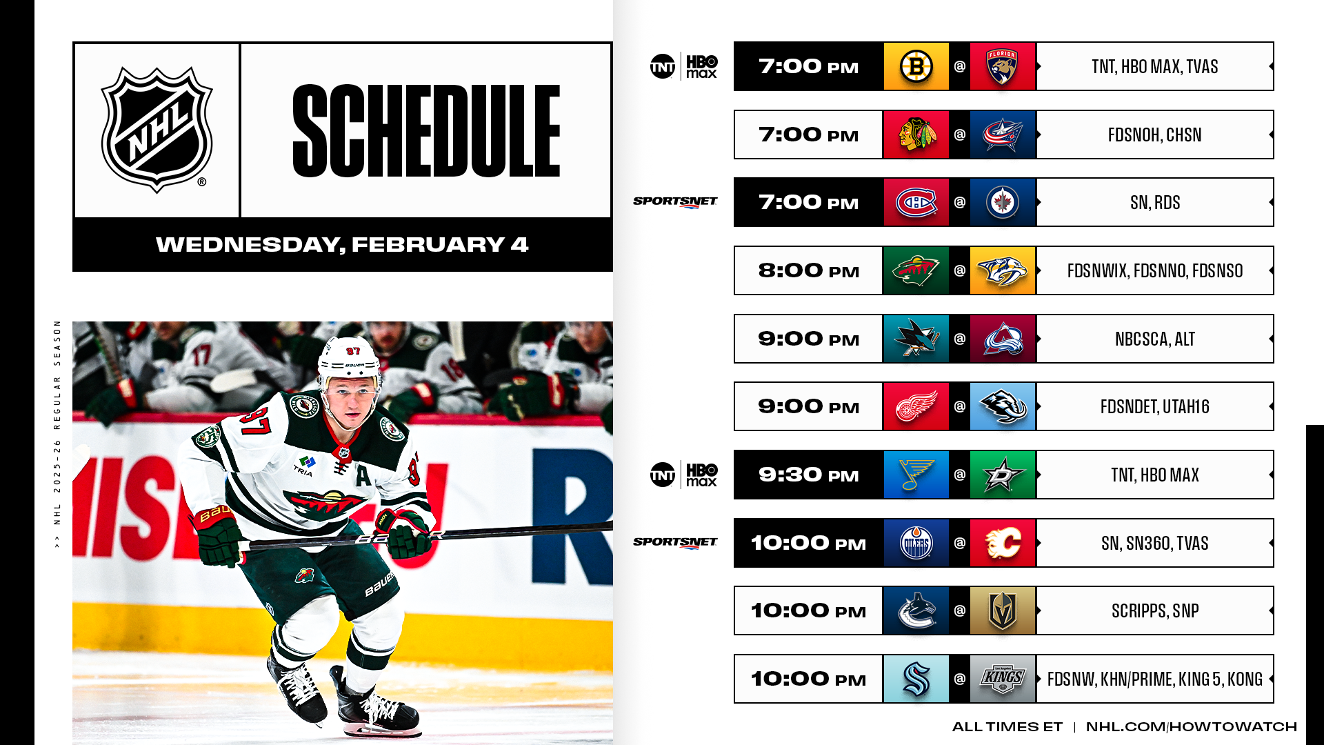 Quinn Hughes and the Wild (33-14-10, 76 points) are one of 20 teams in action Wednesday. The full slate of hockey also includes a pair of all-Canadian matchups when the Canadiens (31-17-8, 70 points) face the Jets (22-25-8, 52 points) as well as the next instalment of the “Battle of Alberta” between the Oilers (28-21-8, 64 points) and Flames (22-27-6, 50 points) as part of a Sportsnet doubleheader.