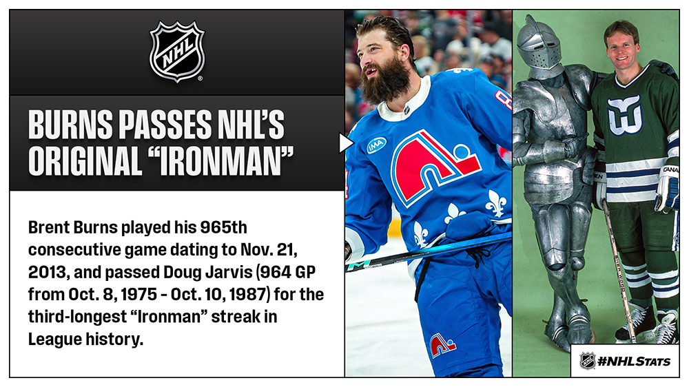 * Brent Burns played in the latest Avalanche-Hurricanes game involving throwback sweaters and passed a former Hartford Whalers forward for the third-longest “Ironman” streak in NHL history. Colorado clipped Carolina and extended its winning streak to 10 games for the second time this season.