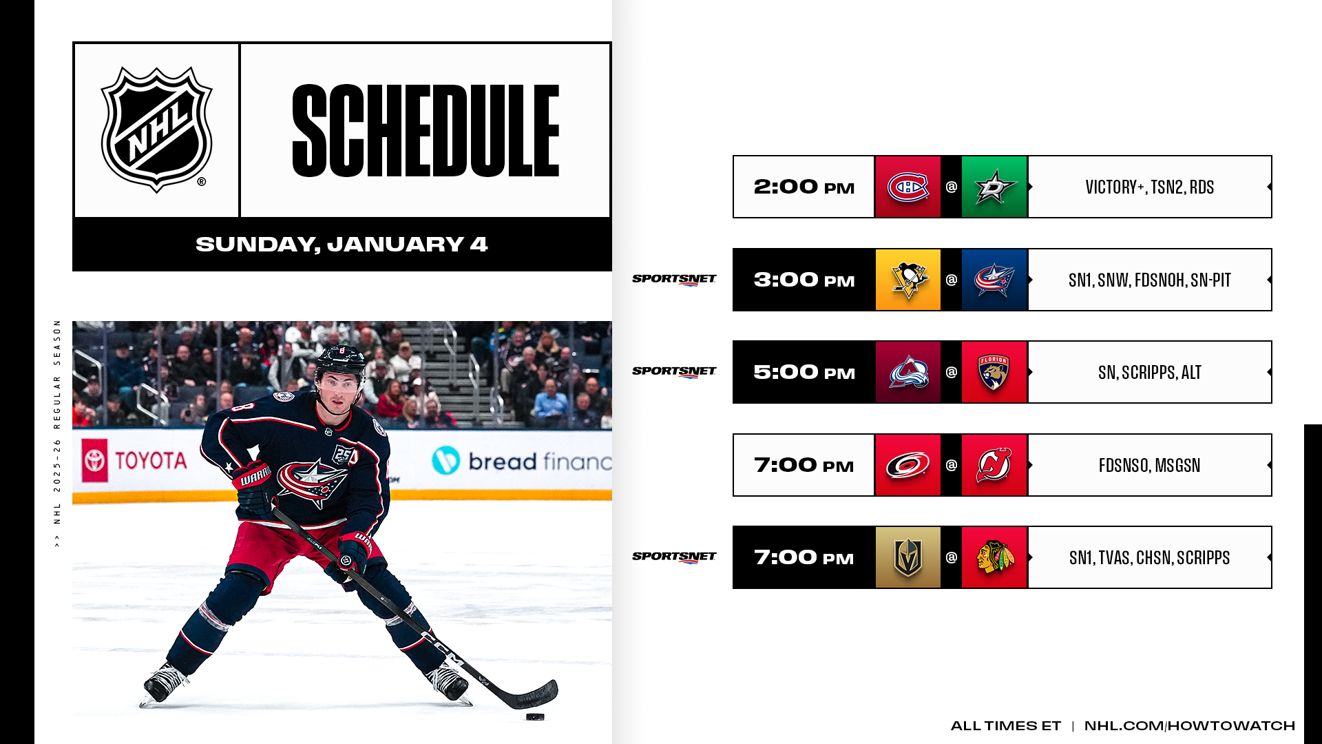 A five-game Sunday will feature seven teams on the last half of back-to-backs and three contests on Sportsnet programming, including a doubleheader on Sportsnet One which will feature the Penguins visiting the Blue Jackets, both coming off wins from Saturday, before the Blackhawks welcome the Golden Knights.