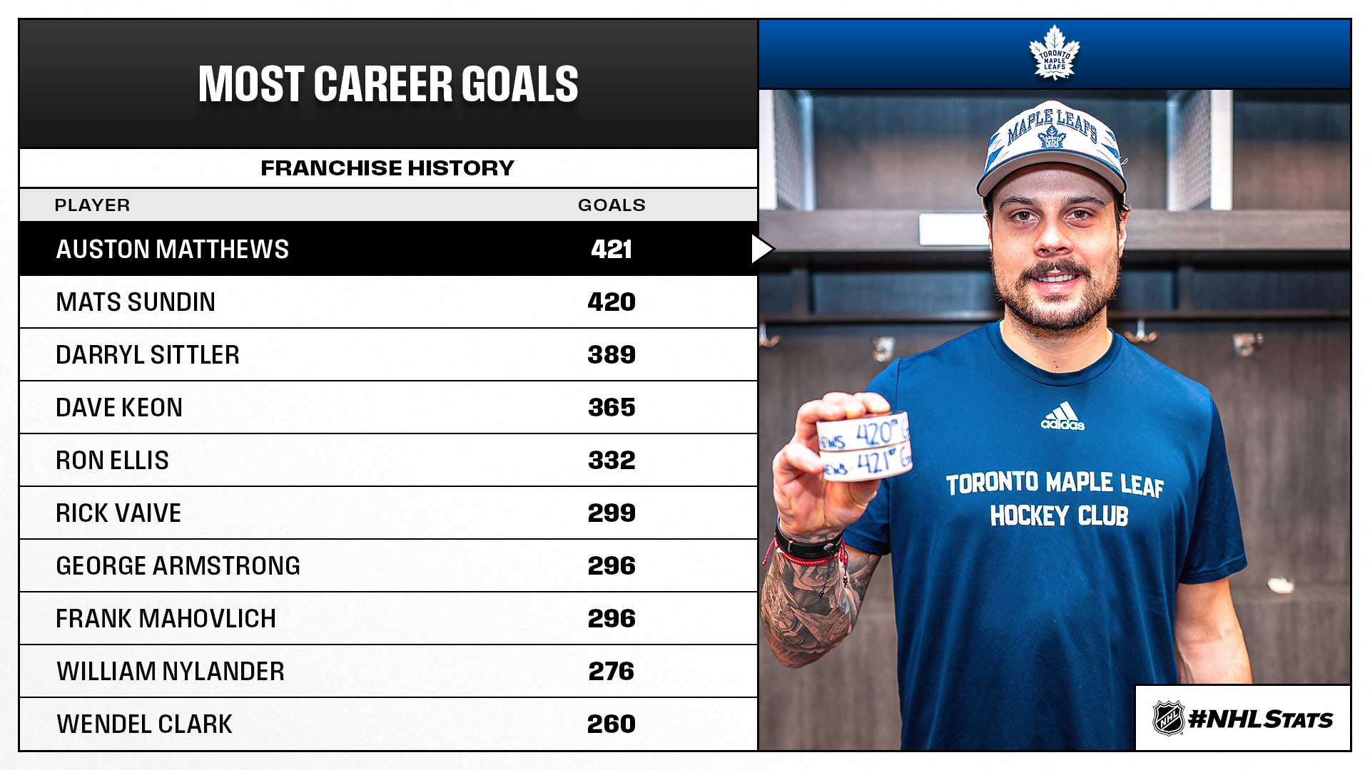 Auston Matthews tallied twice versus the Islanders to reach 421 career goals and leapfrog Mats Sundin (420) as the franchise’s all-time leader, a title Sundin had held since also scoring against New York more than 18 years ago on Oct. 11, 2007.