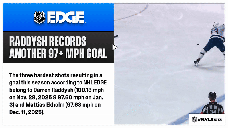 * NHL EDGE clocked Raddysh’s first, second and third tallies at 89.70, 97.60 and 92.19 mph, respectively. He accounts for two of the three hardest shots resulting in a goal this season.