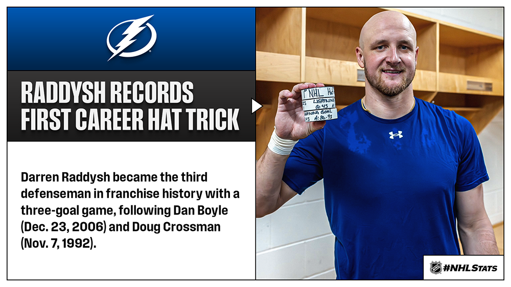 * Darren and Taylor became the second set of brothers in the NHL’s modern era (since 1943-44) to each score a hat trick during the same season where one was a defenseman and the other was a forward, following Rangers teammates Don (Jan. 6 & March 31, 1980) and Dave Maloney (March 9, 1980). The Raddysh siblings were also the first brothers to each score a hat trick against the same opponent in a season since Quebec Nordiques teammates Marian (Oct. 21, 1982) and Peter Stastny (Dec. 11, 1982) did so versus Pittsburgh.
