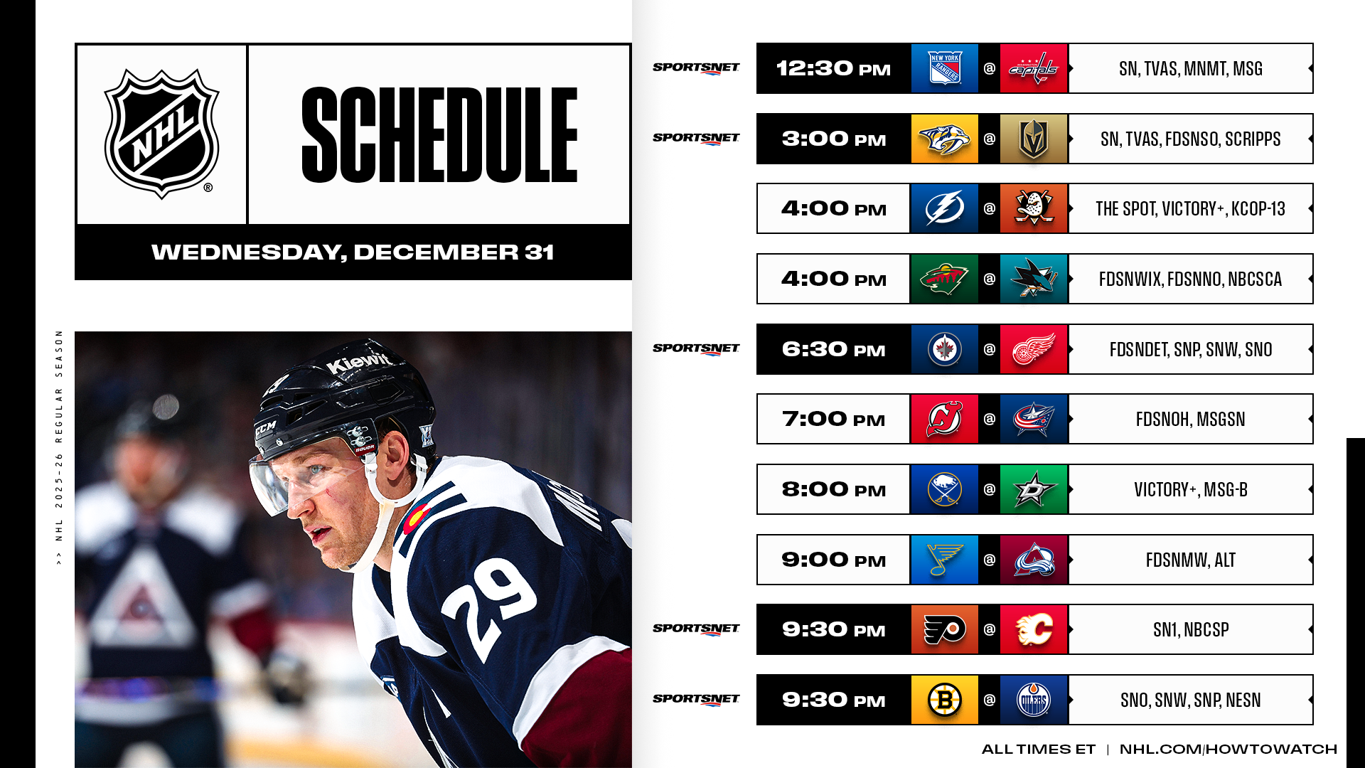 The lead-in to New Year’s Eve festivities and the turning of the calendar at midnight includes a full day of hockey spanning 12 hours of continuous NHL action with half of those contests available on Sportsnet programming in Canada.