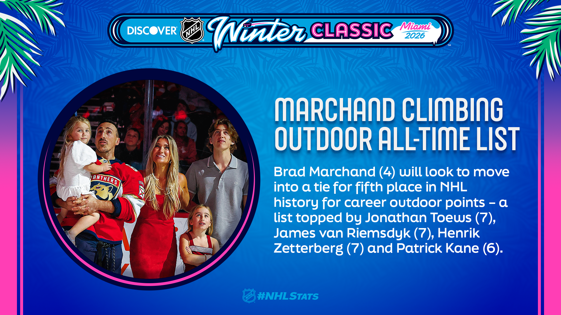 * Brad Marchand, who was honored for his 1,000th NHL point with a pre-game ceremony, is hoping to don a Team Canada jersey in February. Marchand extended his goal streak Tuesday and will carry a three-game run into the 2026 Discover NHL Winter Classic (Jan. 2 at 8 p.m. ET on TNT, HBO Max, SN, TVAS). Marchand has skated in three outdoor games – the most among all Panthers – and owns a perfect 3-0-0 record (2019 WC, 2021 LT-SUN & 2023 WC). He can move into a tie for the second-most NHL outdoor wins among skaters. Click here for the full #NHLStats Pack: 2026 Discover NHL Winter Classic to get set for the event.