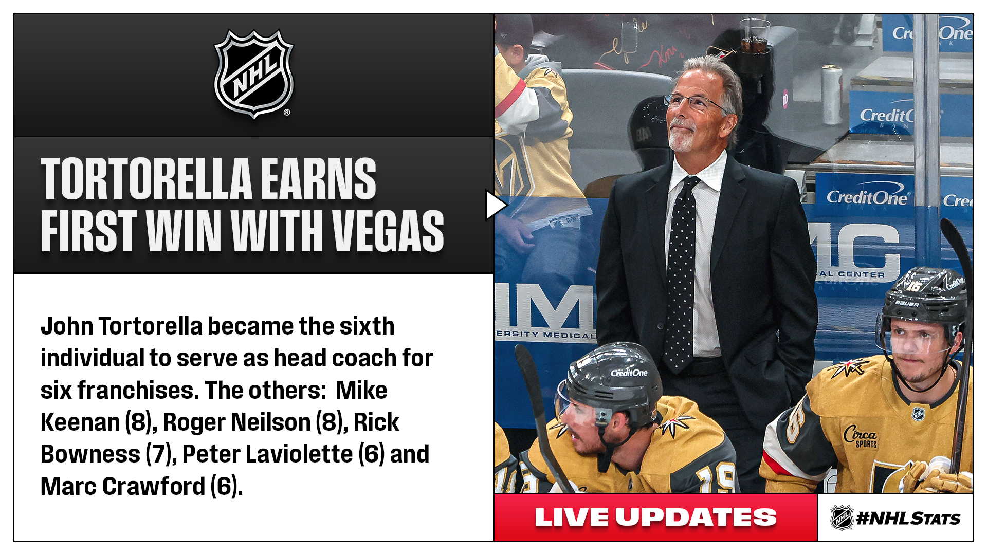 TORTORELLA COACHES GOLDEN KNIGHTS TO VICTORY IN #NHLSTATS: LIVE UPDATES