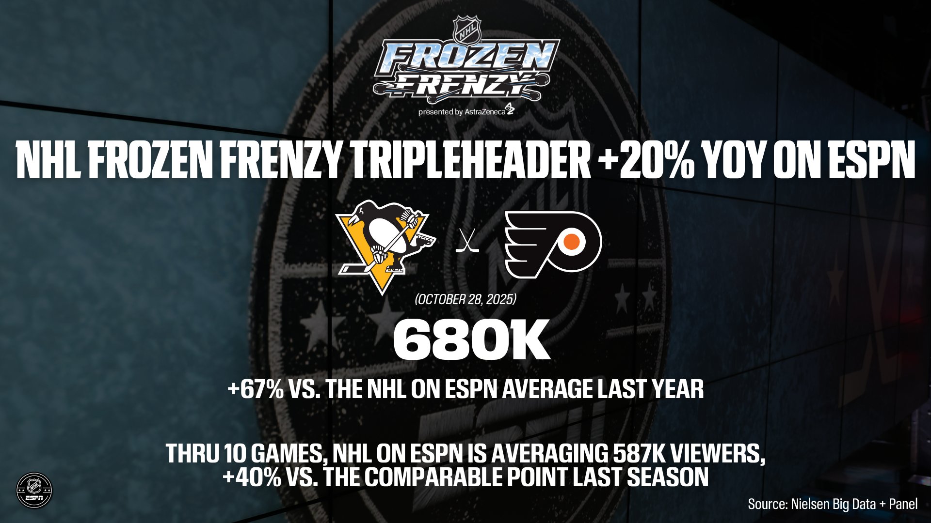 * Tuesday’s NHL Frozen Frenzy tripleheader up 20% YoY on ESPN