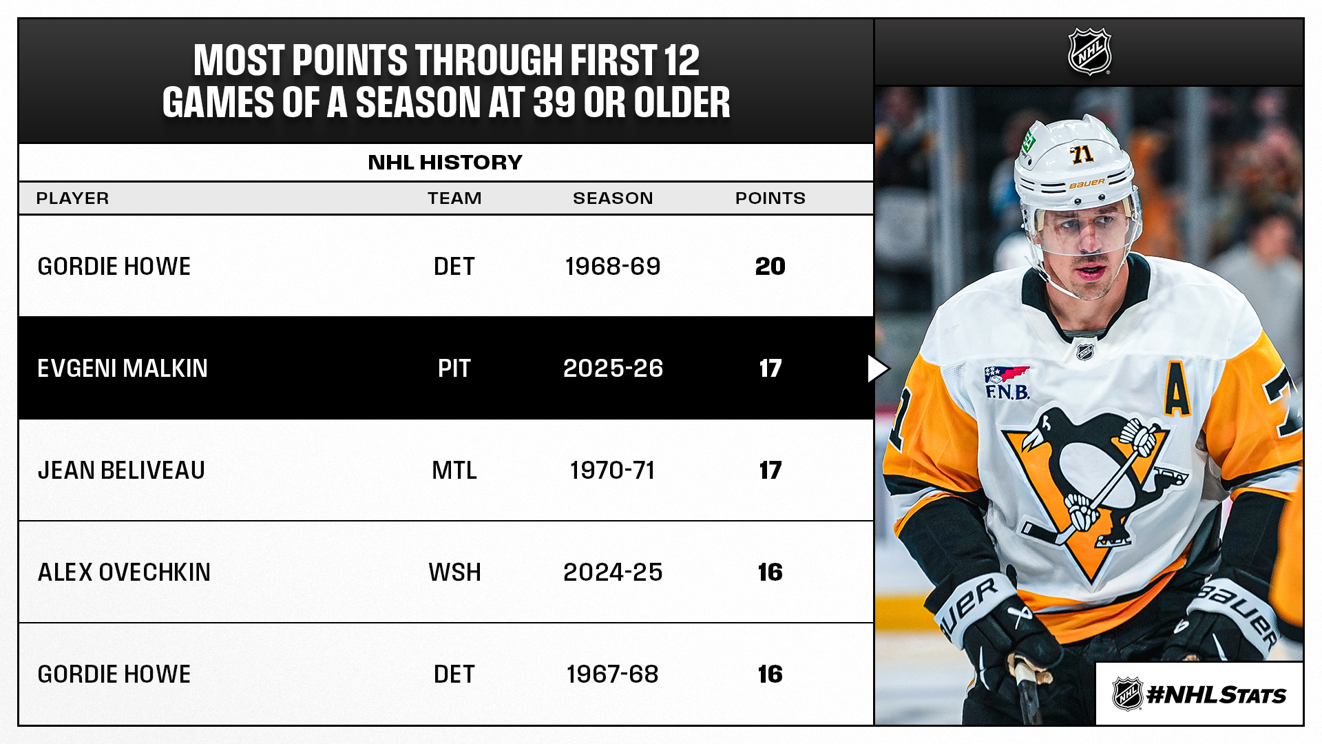 Evgeni Malkin continued his hot start to the season and helped the Penguins move into first place in the League standings, while Mark Scheifele and the reigning Presidents’ Trophy-winning Jets soared to the top spot in the West. * Trevor Zegras notched his second three-point outing in three games and helped the Flyers post their longest home winning streak since 2019-20.