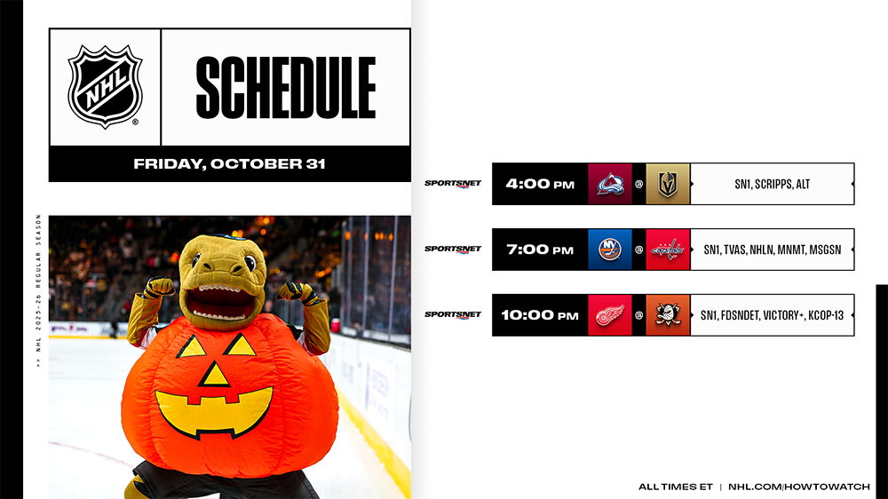 Each contest during the NHL’s three-game Halloween slate will be carried by Sportsnet ONE in Canada, starting with a matinee between the Avalanche and Golden Knights at T-Mobile Arena as Nevada Day is observed in “The Silver State.” Colorado (6-1-4, 16 points) and Vegas (6-1-3, 15 points) are the only teams with just one regulation loss this season.