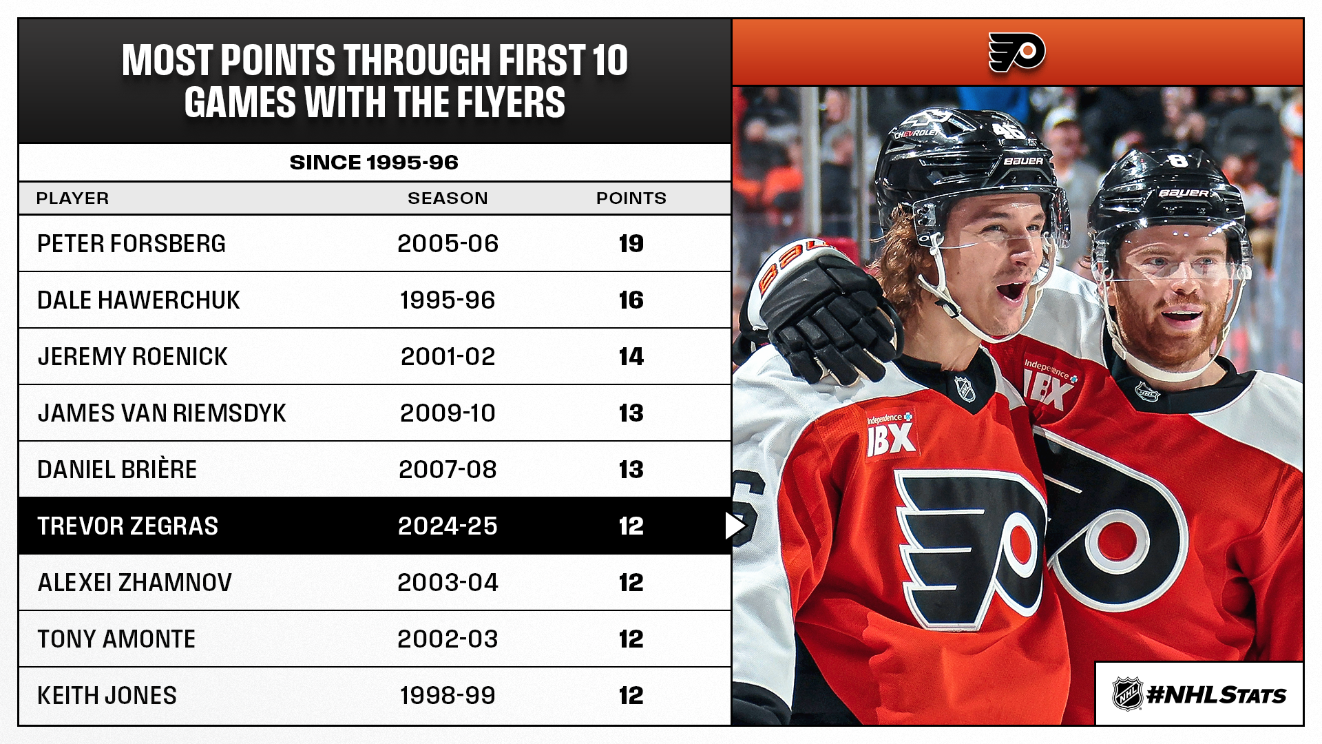 * Zegras (4-8—12 in 10 GP), who sits tied with Justin Brazeau (6-6—12 w/ PIT) and Mitch Marner (2-10—12 w/ VGK) for the most points among players skating on a new team in 2025-26, boosted his totals thanks, in part, to seven straight home games with a point. He became the first Flyers skater with at least 12 points through their first 10 contests with the franchise since James van Riemdsyk (2-11—13 in 2009-10).