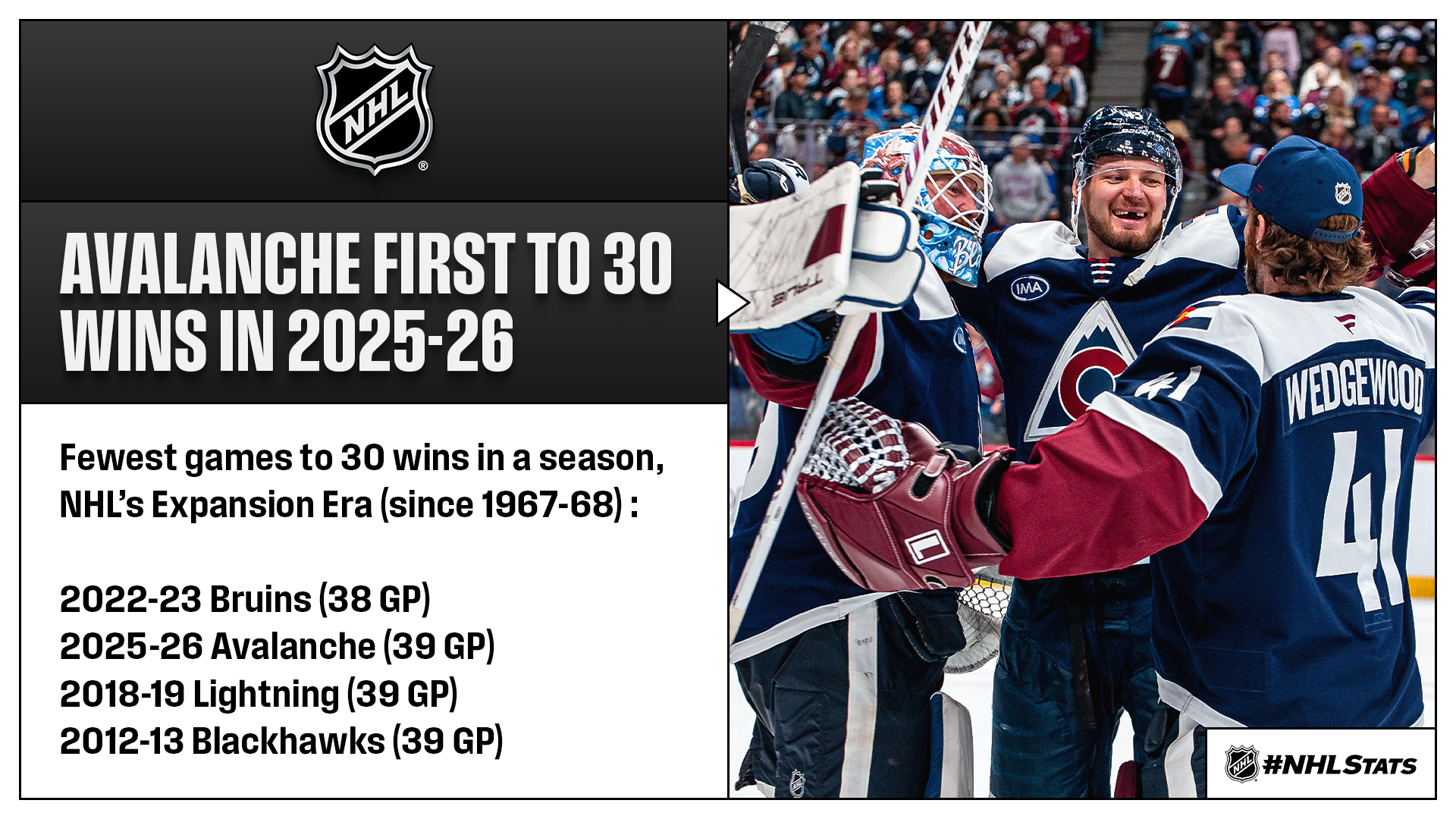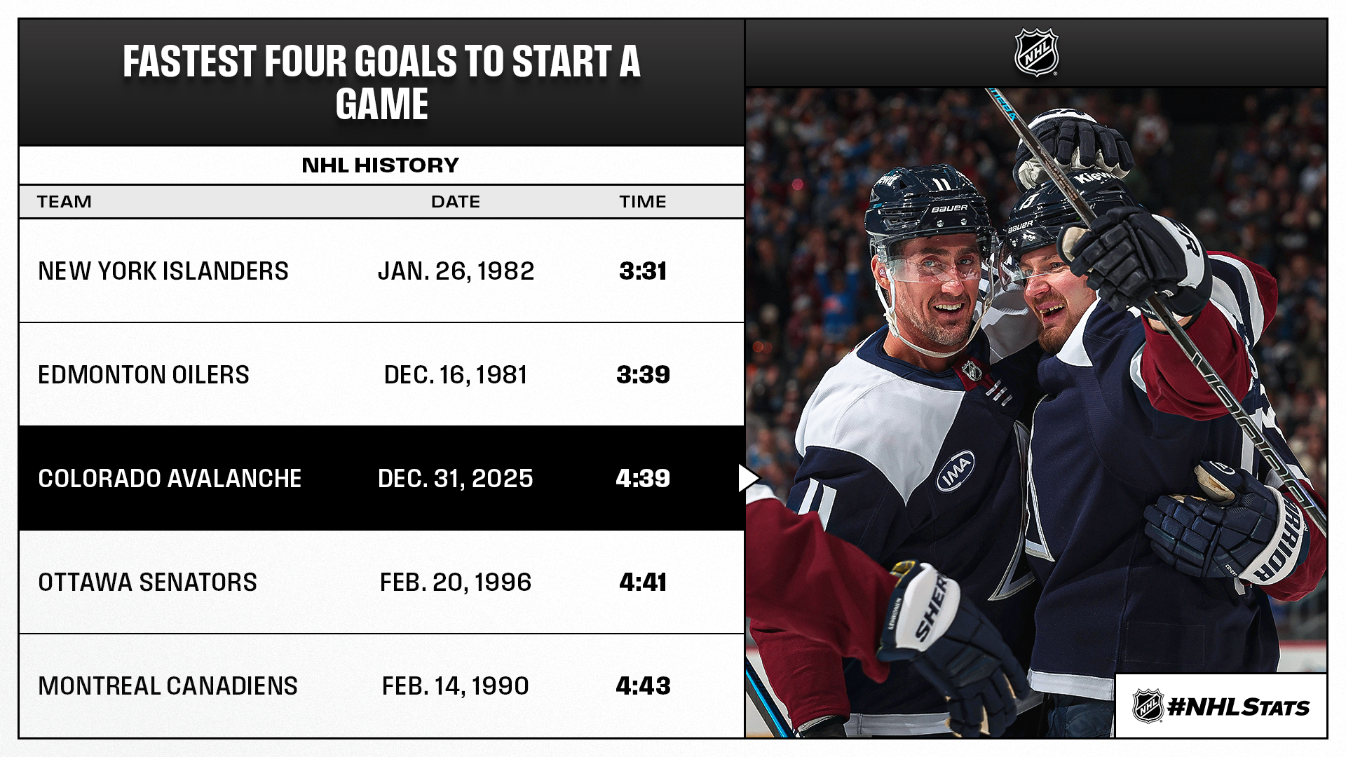 * MacKinnon (34-36—70) and Connor McDavid (24-46—70), who will both suit up for Team Canada at the Olympic Winter Games Milano Cortina 2026, and each recorded their 70th point of the season Wednesday and made 2025-26 the first campaign since 1995-96 (Mario Lemieux & Jaromir Jagr) to feature multiple players hit the mark before New Year’s Day.