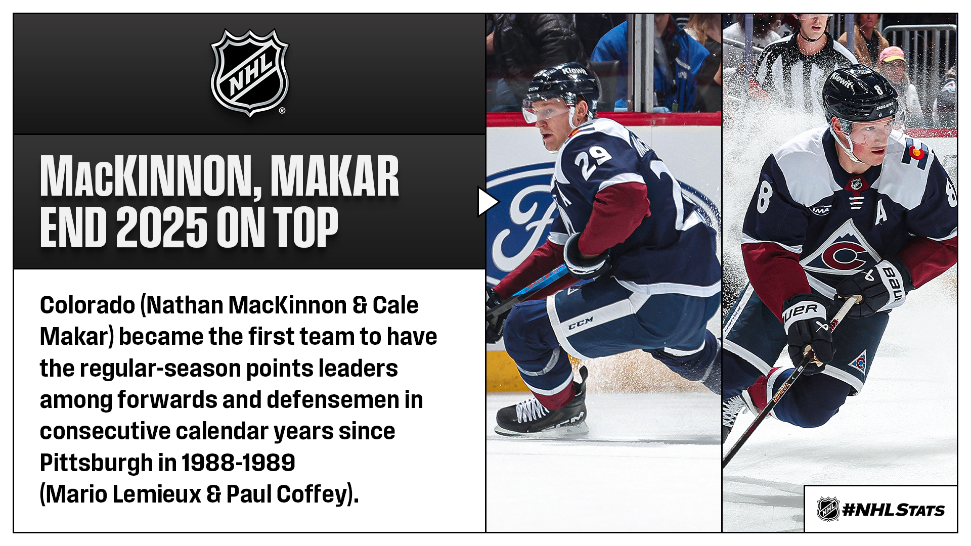 * Cale Makar collected an assist in the win and finished 2025 with 31-60—91 in the regular season – tops among defensemen after also pacing them in 2024. He became the first blueliner to lead his position in regular-season points in consecutive calendar years (outright or tied) since Nicklas Lidstrom (1999-2000).