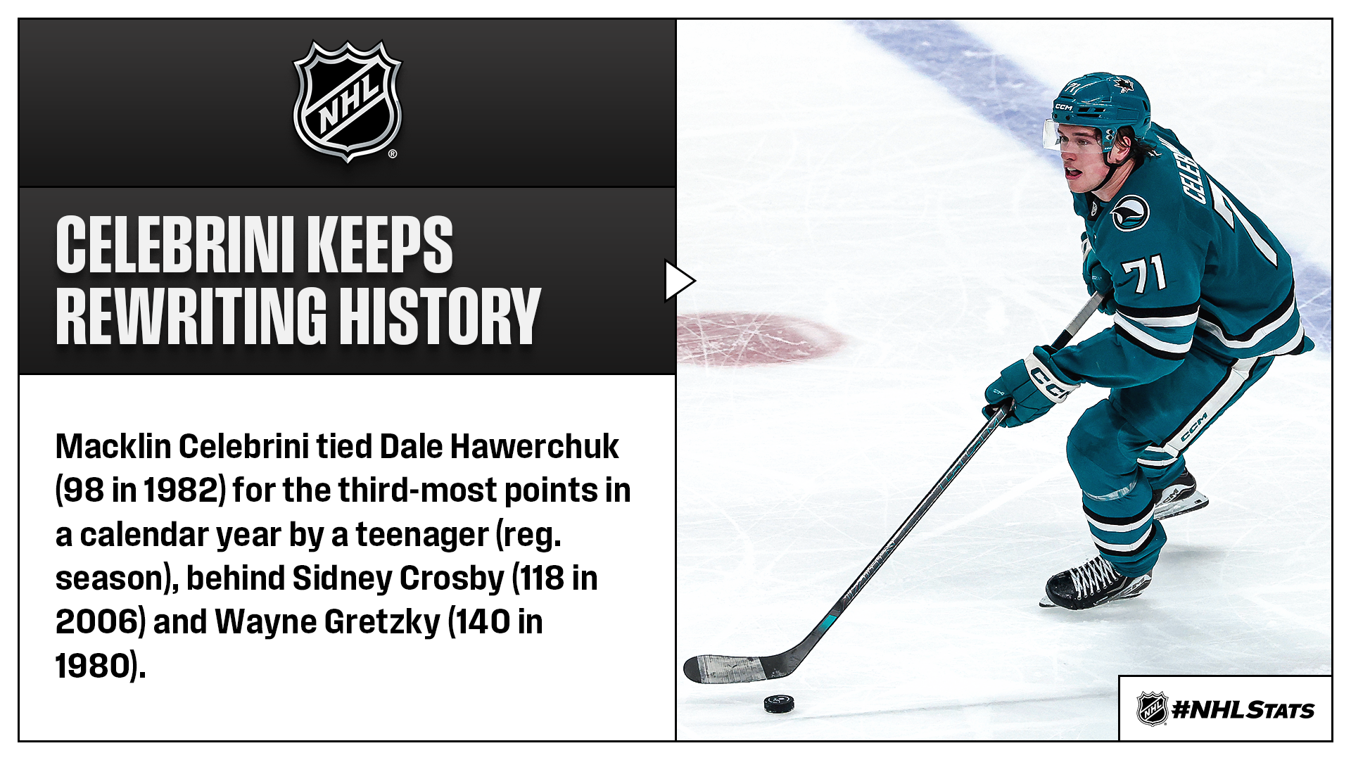 * Celebrini (1-1—2) collected two points and scored in the shootout to help the Sharks (20-17-3, 43 points) surpass the Kings (16-13-9, 41 points) for the first Wild Card seed in the Western Conference. He became the third-fastest teenager to 40 assists in a season in NHL history, behind Sidney Crosby (34 GP in 2006-07) and Wayne Gretzky (36 GP in 1980-81). Celebrini can become the youngest player and only teenager to play for Team Canada at Olympics involving NHL players.